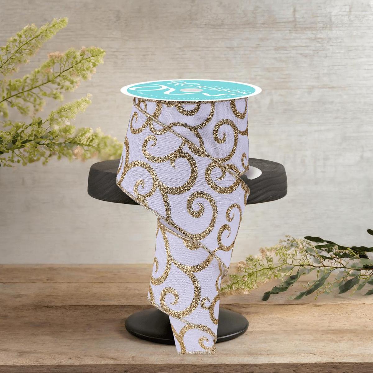 2.5" Glitter Swirl Ribbon: White/Gold (10 Yards)
