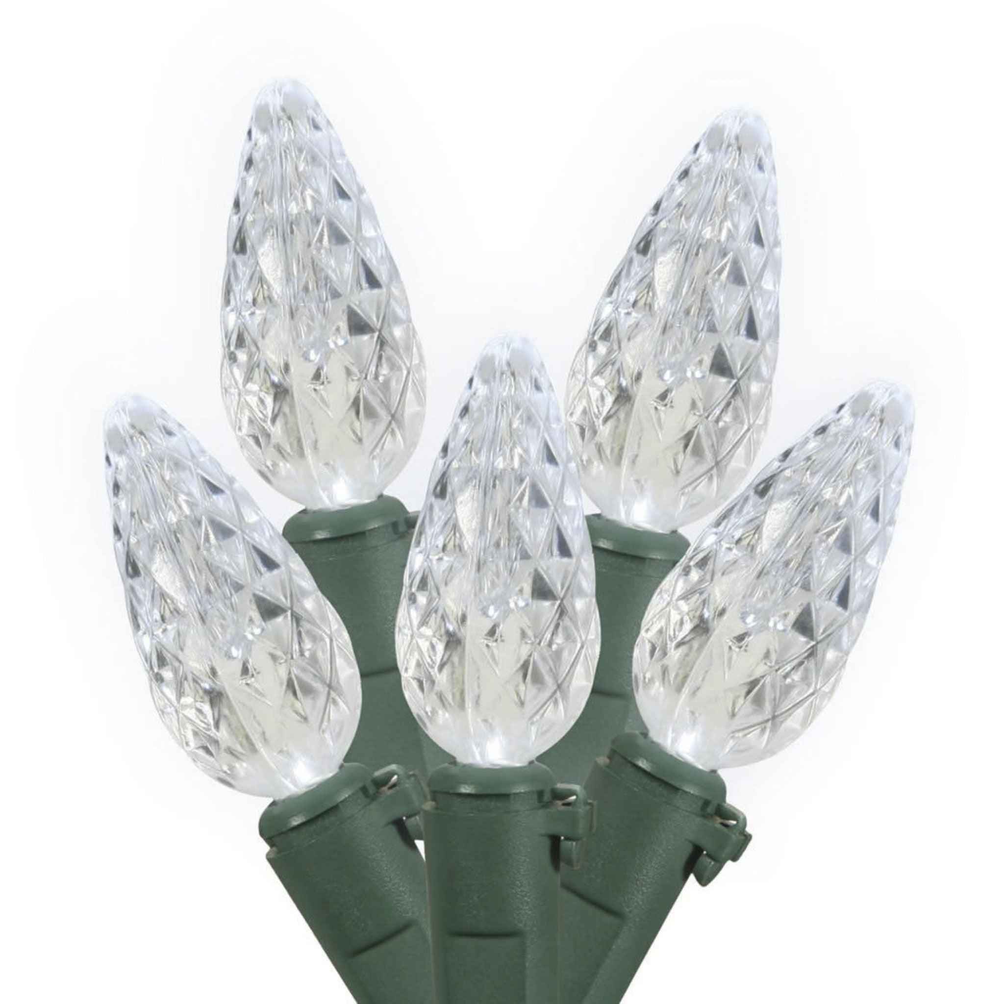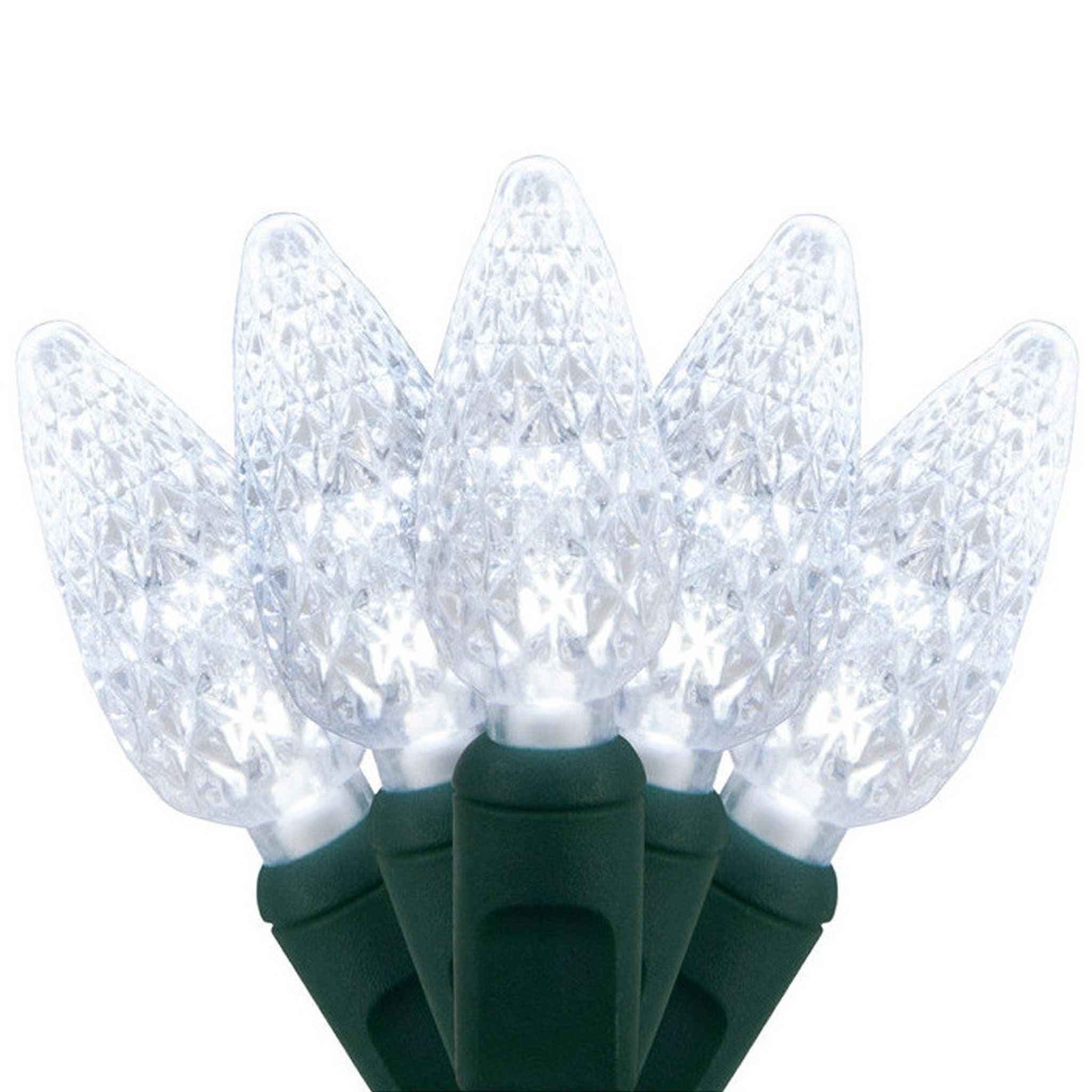 Upgrade your holiday lighting with Lee Display's C6 LED Clear Cool White Christmas String Lights featuring green wire. These energy-efficient lights are designed for outdoor use, providing bright and reliable illumination while minimizing power consumption.