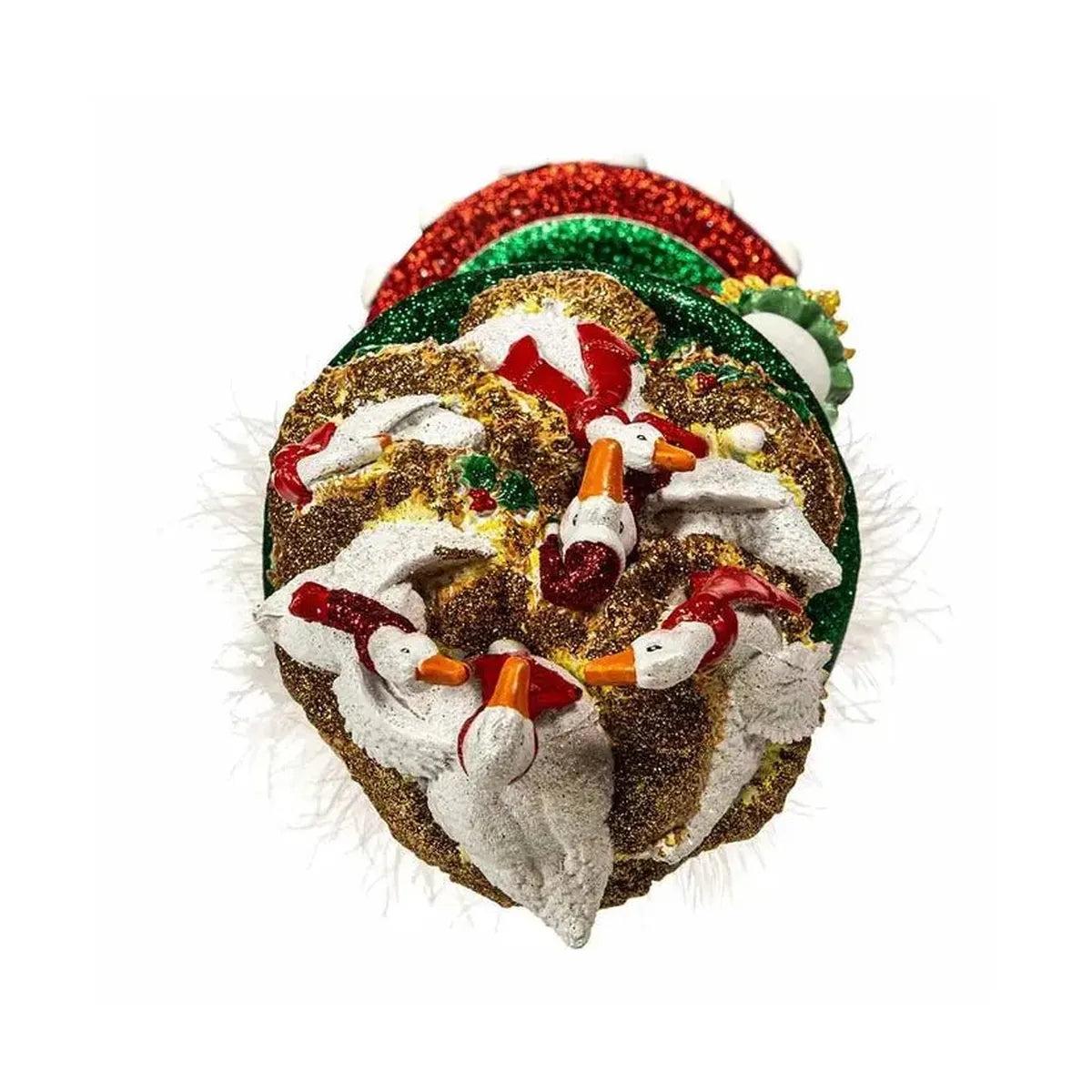 Hollywood Nutcrackers™ is a whimsical collection of nutcrackers created exclusively for Kurt S. Adler, Inc. and features an assortment of designs that put a unique, vibrant, memorable twist on traditional nutcrackers. This 18-inch Six Geese A Laying Nutcracker features six geese atop a gold glittered nest hat. In one hand he is holding a basket of eggs and in the other he is holding an egg topped staff. He stands on a red and green glittered base decorated with white eggs. Item # HA0609