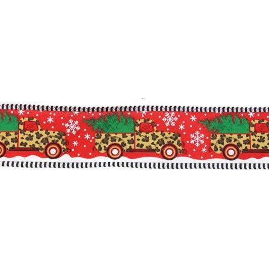 Load up on trees and creative ideas with the help of this 2.5" Leopard Snow Striped Edge Ribbon: Red (10 Yards)! This faux royal burlap ribbon includes a wired edge and a red base, and features a row of leopard print trucks hauling Christmas trees on a snowy day! Use this ribbon among your Christmas-themed decor, ideally a wreath, outfitted with complementary enhancements! RGA819324