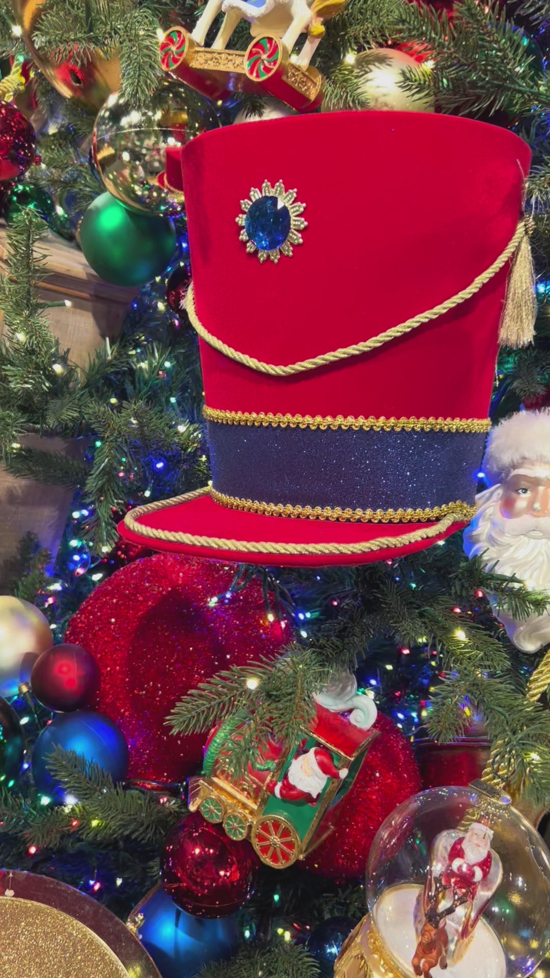 This 8.25" Nutcracker Hat Tree Topper showcases a polyester design in red and blue, with a navy blue trim and gold roping that is nutcracker-themed. The topper is designed with an opening to easily place it on top of your tree. 4516703