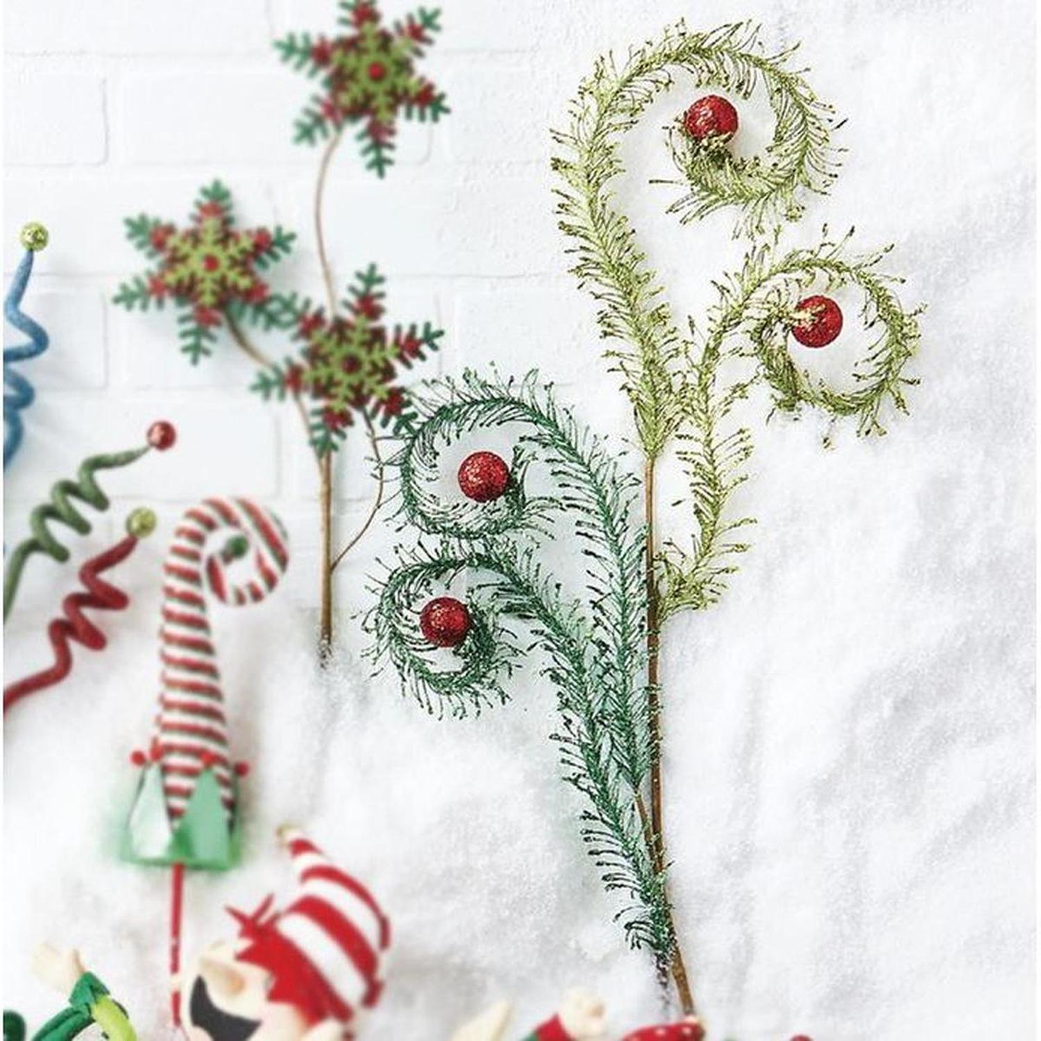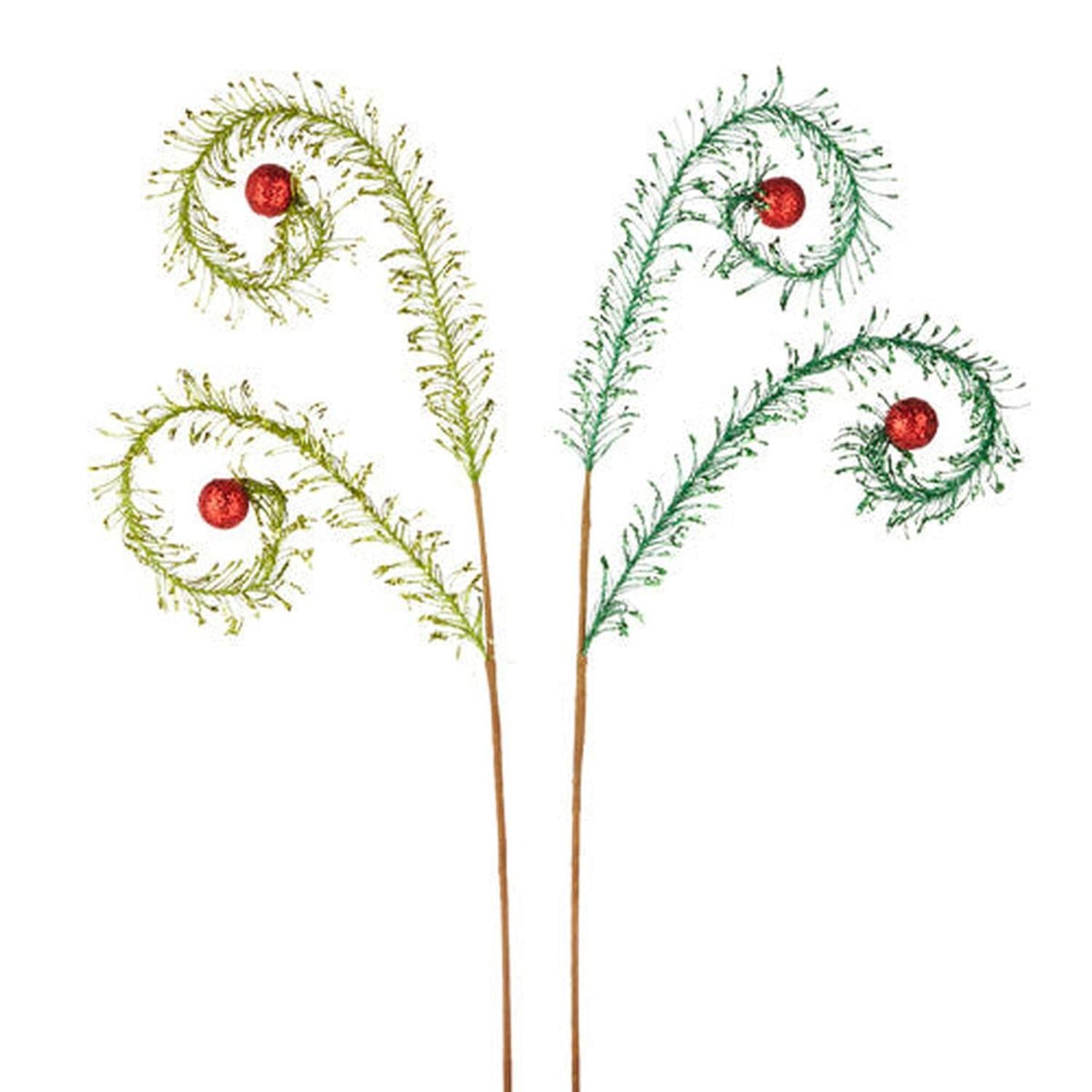 Add a super fun texture to your decor with these 28" Glittered Feather Sprays in Dark Green! Each one features feather shape covered in glitter and topped with a red glitter ball! Sold Individually Dimensions: 28". F4106733