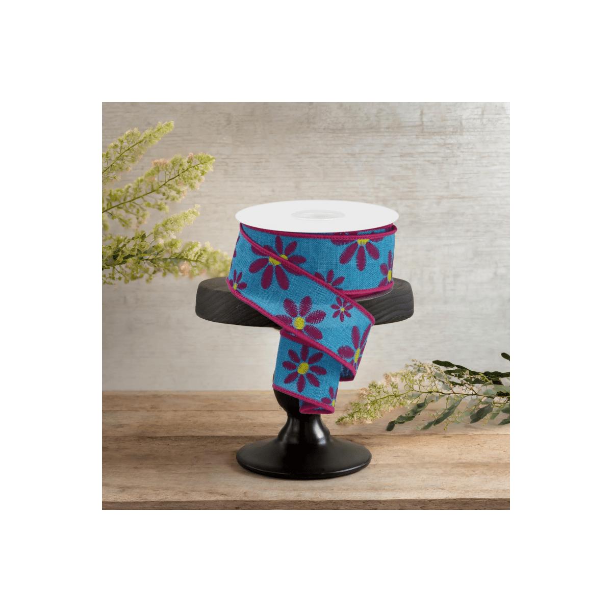 A ten yard roll of 1.5" light teal royal canvas ribbon with mixed embroidered fuchsia daisies with a yellow middle on each. Celebrate the season in bloom by decorating with this lovely embroidered mixed daisy ribbon! This ribbon includes a wired edge, along with a collection of fuchsia and yellow daisies against a turquoise base! RGE1191A2