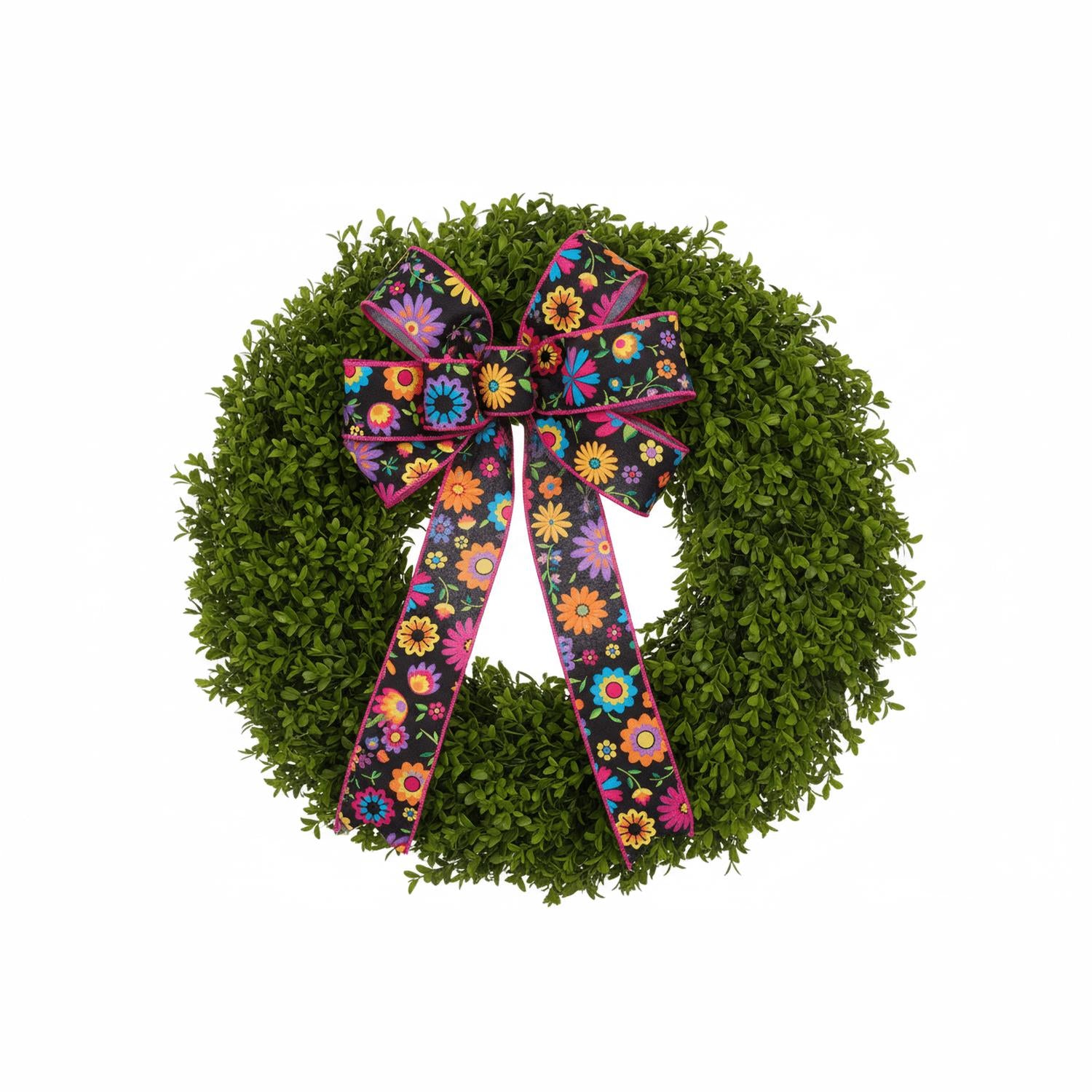 Add a vibrant burst of color to your crafting projects with this stunning Black Fiesta Florals wired edge ribbon. Measuring 1 1/2 inches wide and spanning a generous 10 yards in length, this premium ribbon features a playful array of multicolored flowers set against a striking black background. The design showcases cheerful daisies and blooms in vivid shades of pink, blue, yellow, and orange, accented with delicate green leaves. The hot pink edge trim adds an extra pop of color while the convenient wire edge allows for easy shaping and superior hold. Perfect for creating eye-catching wreaths, enhancing gift presentations, crafting beautiful garlands, or adding flair to floral arrangements. The durable construction ensures the ribbon maintains its shape while being versatile enough for various decorative applications. Transform your creative projects with this festive and versatile ribbon that combines both style and functionality. Part of our Fiesta Collections. RGF1587