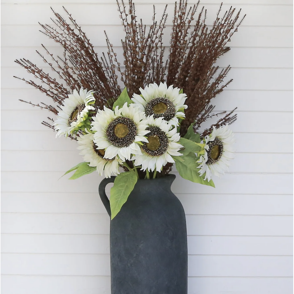 Outfit your floral display with this lovely faux 33" Sunflower Stem in Ivory to bring a lush pop of color! This sunflower will make for a striking addition to your home decor, thanks to its ivory/cream petals, green leaves and detailed center! Pair this sunflower with some wildflower sprays or picks to match the theme! Use this stem as the centerpiece of a wreath to get the most from its good looks! Add additional ribbon, sprays or signs to create the perfect display. Complete your design using Fall/Autumn Collection! FS365730