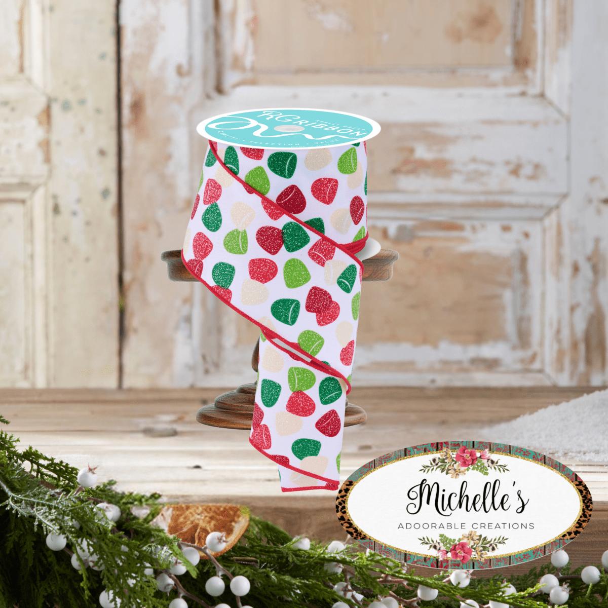 Experience timeless elegance and unleash your creativity with this high-quality 2.5" Glitter Gumdrop Ribbon in primary colors (10 Yards). Its white primary canvas base is adorned with glitter gumdrops in vibrant red, green and cream. The wired sewn edge allows for easy shaping and manipulation, making it perfect for creating beautiful bows, wreaths, garlands, and other decorative accents. Versatile and eye-catching, this ribbon is an excellent choice for holiday decorations, floral arrangements, gift wrapping, and various crafting endeavors. Elevate your projects with this professionally crafted ribbon that exudes formal, educational, and informative tones. RGF1631HF
