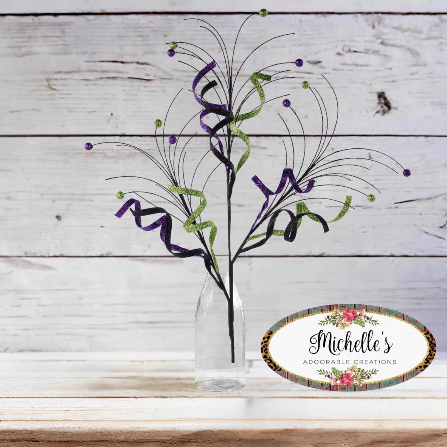 This 35" Glitter Curly Fishline Ball Spray adds a fun and quirky touch to your decorations with its curly stems and sparkling glitter finish. Featuring a mix of black, purple, and lime green glitter elements, including filaments made from shimmering fishing line and purple and lime green foam beads, this spray is perfect for celebrating Halloween. XS1452X4