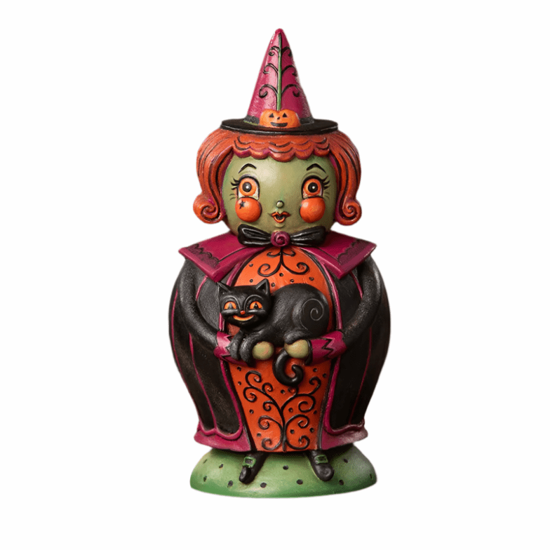 Cast a spell with Johanna Parker’s enchanting Hagatha and Jack Spooks Jar! Dressed in a black cloak with purple accents and an orange dress adorned with vine detailing, Hagatha holds her trusty black cat, Jack. But there's more magic—Hagatha’s head lifts off to reveal a hidden container inside! Perfect for storing little treats or adding a touch of spooky charm to your Halloween decor, this bewitching piece is a delightful way to celebrate the season.