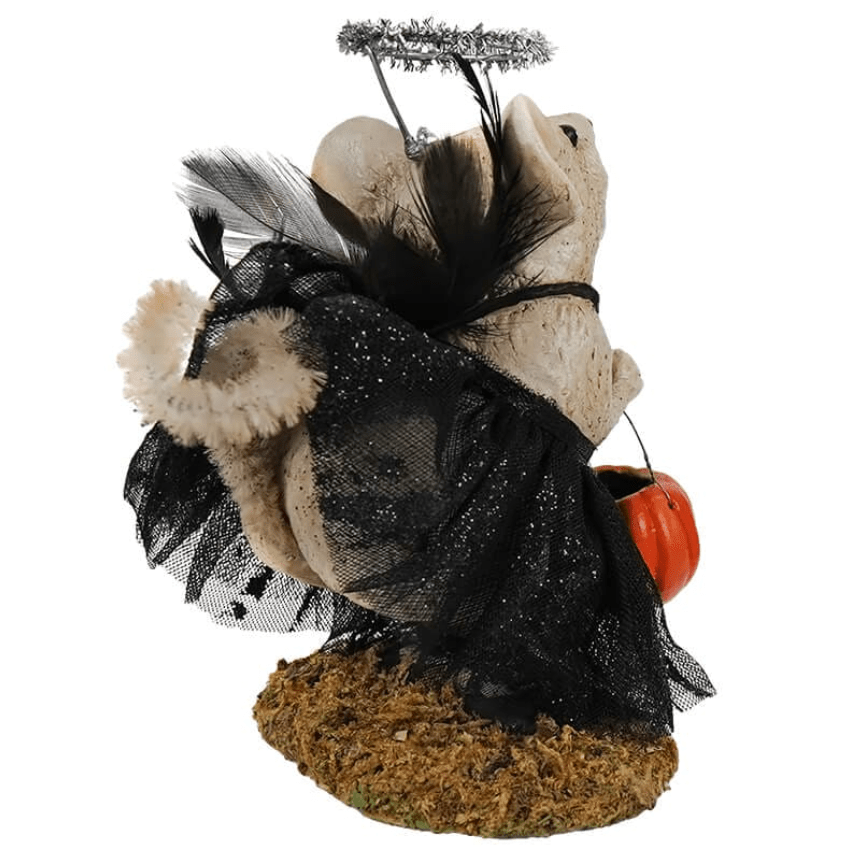 Bethany Lowe Designs presents a vintage-inspired, artisan-crafted Halloween Pixie Mouse figurine, ideal for your seasonal decor. This hand-painted resin figure features delicate tulle, glitter, tinsel, and moss accents. With her glittering silver wand, the little mouse enchants her friends to join her for trick-or-treating. Adorned in a black lace dress with feathery wings and a sparkling tinsel halo, she perfectly blends witch and fairy elements into a charming pixie costume. Compact and detailed, this figurine is perfect for creating a whimsical Halloween display on shelves or mantels.