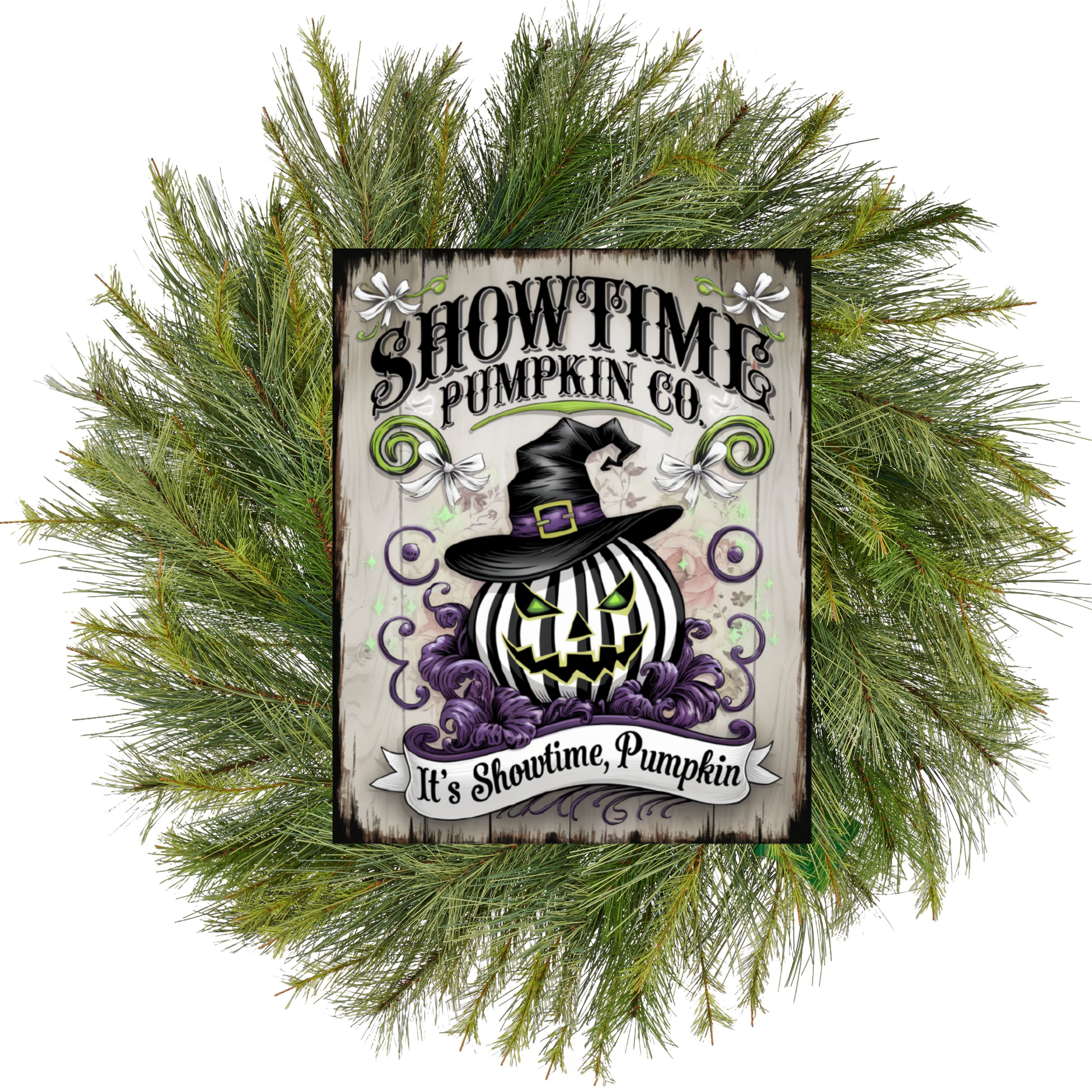 Add a touch of vintage Halloween charm to your seasonal decor with this striking Showtime Pumpkin Co. sign. The eye-catching design features a bold black and white striped pumpkin wearing a classic witch's hat adorned with a golden buckle, set against a weathered background. Elegant white bows and whimsical green accents frame the spooky yet sophisticated artwork, while purple flourishes add depth and visual interest. The sign's vintage-inspired typography and banner scroll reading "It's Showtime, Pumpkin" create a perfect balance of eerie and elegant. Crafted from durable UV-coated aluminum and measuring 10 inches high by 8 inches wide, this decorative piece makes a stunning addition to your Halloween displays. The sign's high-quality construction ensures the vivid details and colors remain striking throughout the season. Perfect for mounting on walls, incorporating into seasonal vignettes, or adding to Halloween-themed gallery displays, this versatile piece brings a professional touch to your holiday decorating.