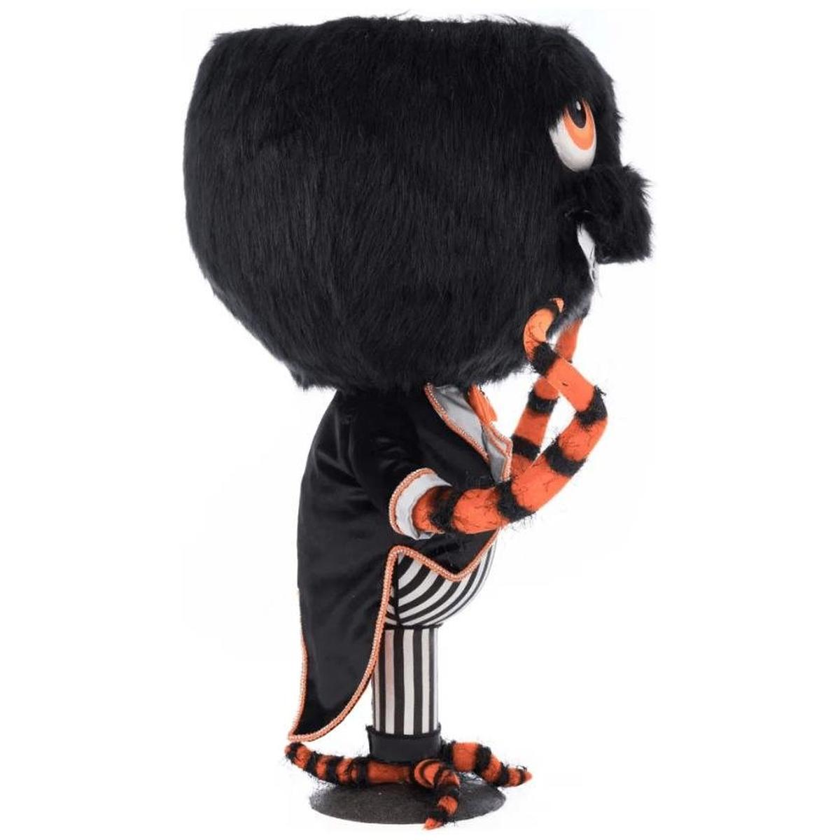 Octavius Macabre is the most stylish confectionery keeper of the eerie elite! He is dressed in striking orange and grey satin accents. Sequins and jewels add a touch of opulent charm, while his spindly limbs lend an air of whimsical mischief. His fluffy fur-covered head gives him a delightful presence, but the real magic lies within his satin-lined container. Made by Katherine's Collection "The Macabre Family" Collection