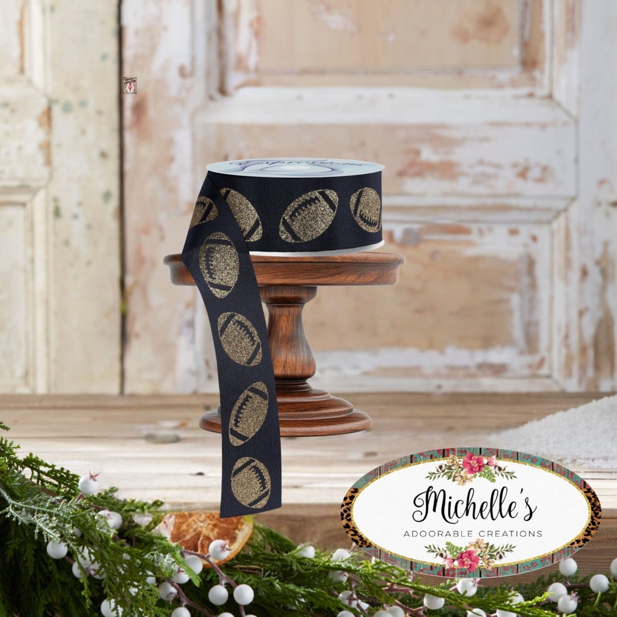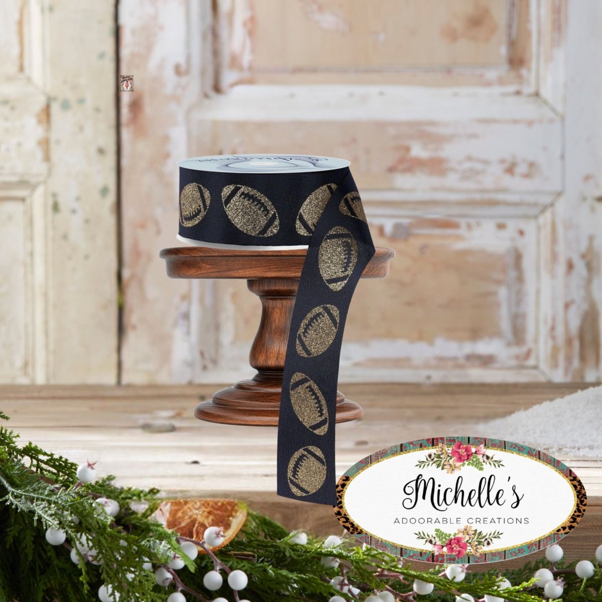 1.5" Glitter Football Ribbon: Black/Gold (100 Feet)