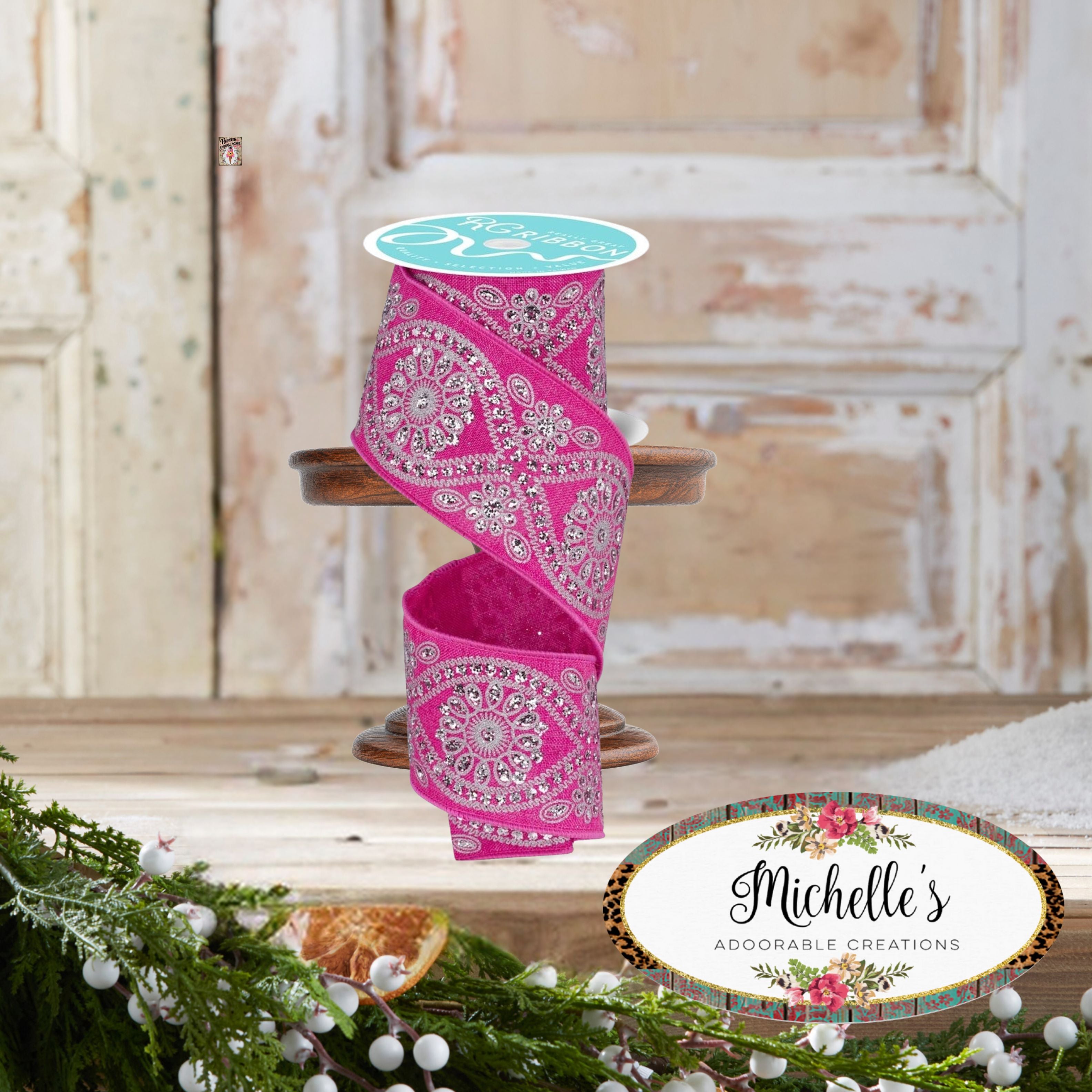 This 2.5" Deluxe Wavy Floral Ribbon features a stunning design reminiscent of embroidery and sequins, but with metallic silver paint and glitter accents. Mandala-inspired circles are centered within undulating silver borders, and glittered flowers and leaves adorn the valleys of this fuchsia ribbon. RGF141207