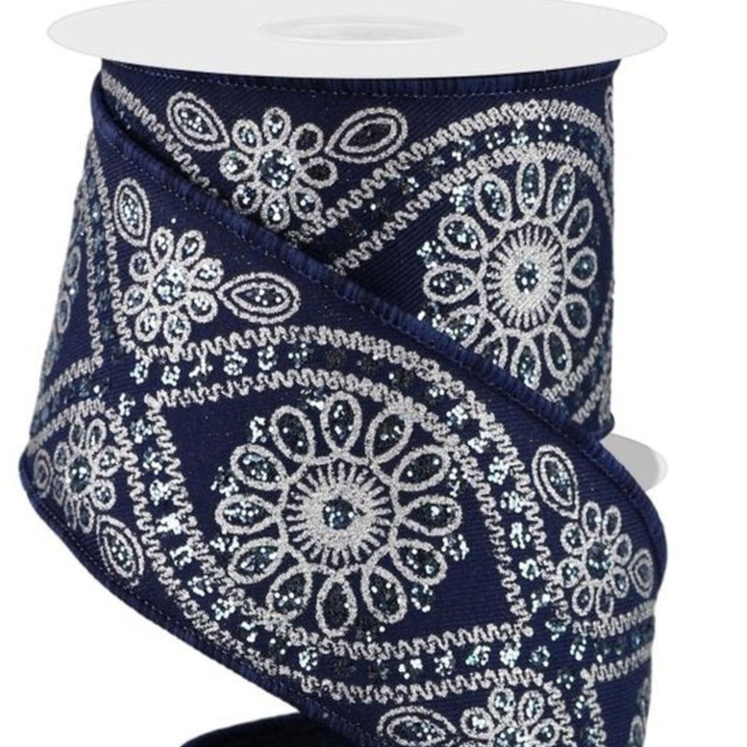 This 2.5" Deluxe Wavy Floral Ribbon features a stunning design reminiscent of embroidery and sequins, but with metallic silver paint and glitter accents. Mandala-inspired circles are centered within undulating silver borders, and glittered flowers and leaves adorn the valleys of this navy blue ribbon. RGE196263