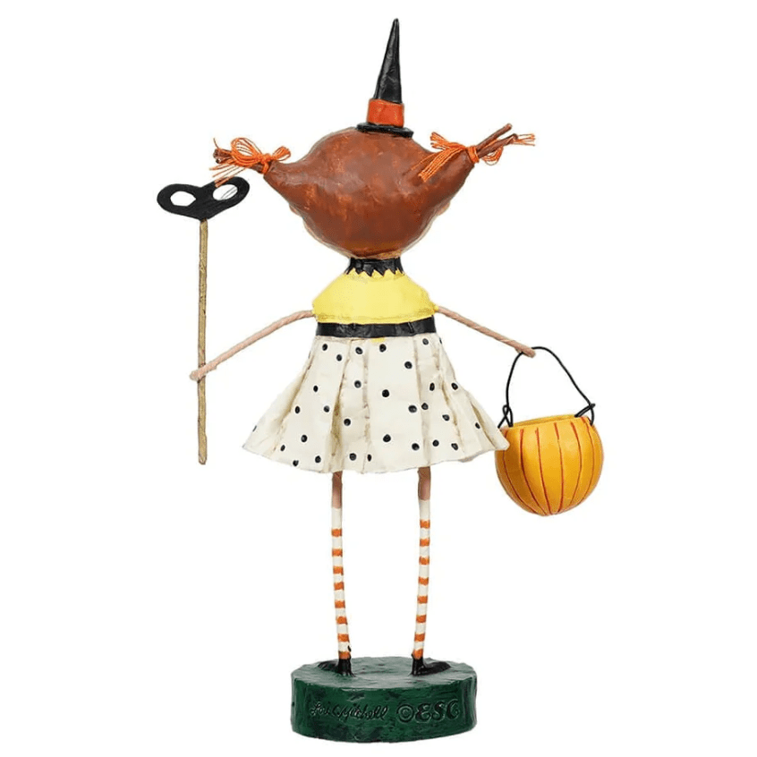 Bring playful charm to your Halloween display with the Flirty Gertie Witch Figurine by Lori Mitchell. Standing 8 inches tall, this retired resin collectible features a red-haired girl dressed in a belted flurry polka-dot skirt, a sunny yellow top with a black collar, a pumpkin bucket, witch hat, and a masquerade wand. Her vibrant pigtails and excited expression add a whimsical touch to your festive decor.