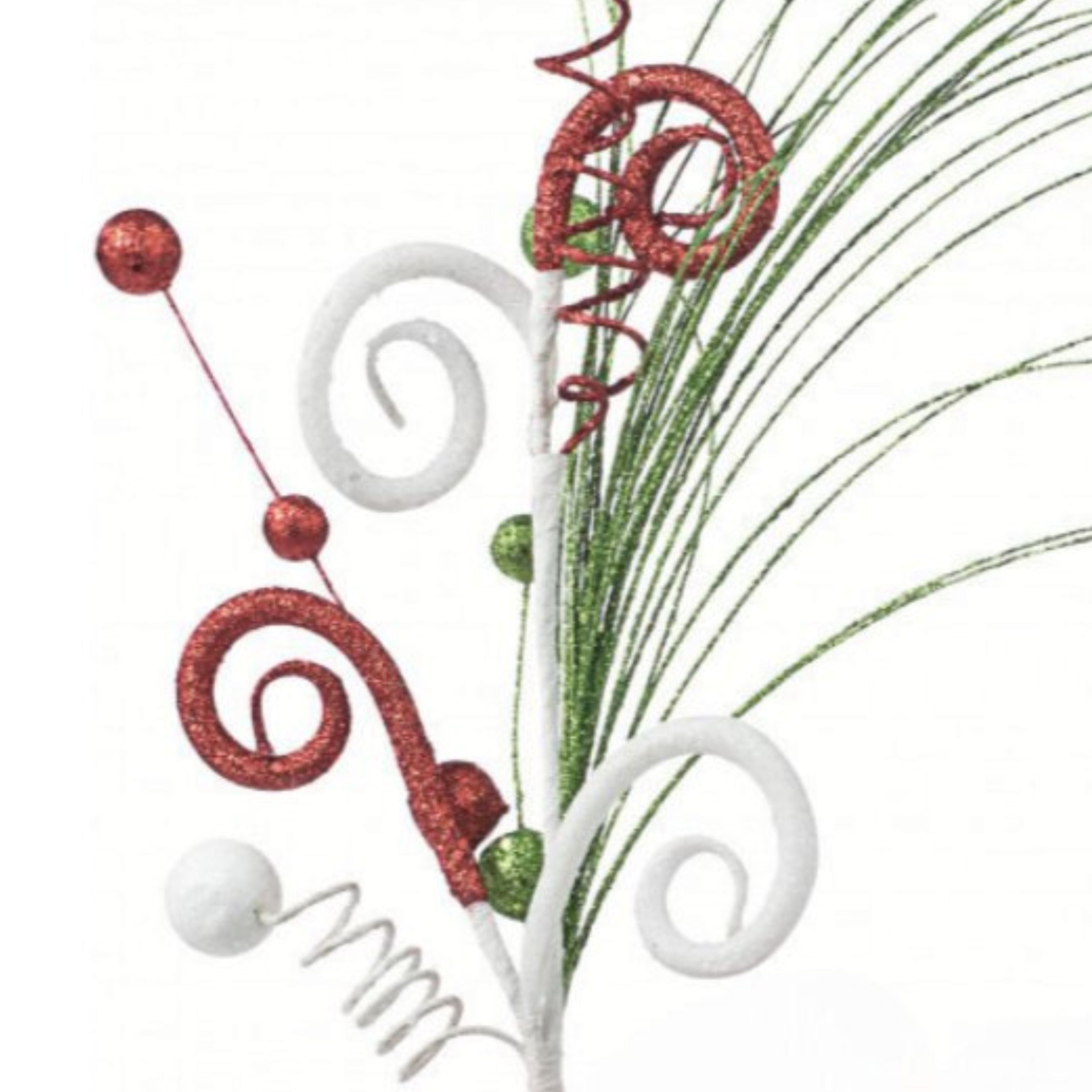 Elevate your Christmas decor with our 18" Glitter Curly Ball Pick! With green glitter ball grassy shoots, red and white balls on springs, and wired spirals, this pick adds a burst of whimsical fun to any display. Perfect for elf, green monster, or traditional Christmas themes, this pick will surely bring cheer to your home. 82509RWG