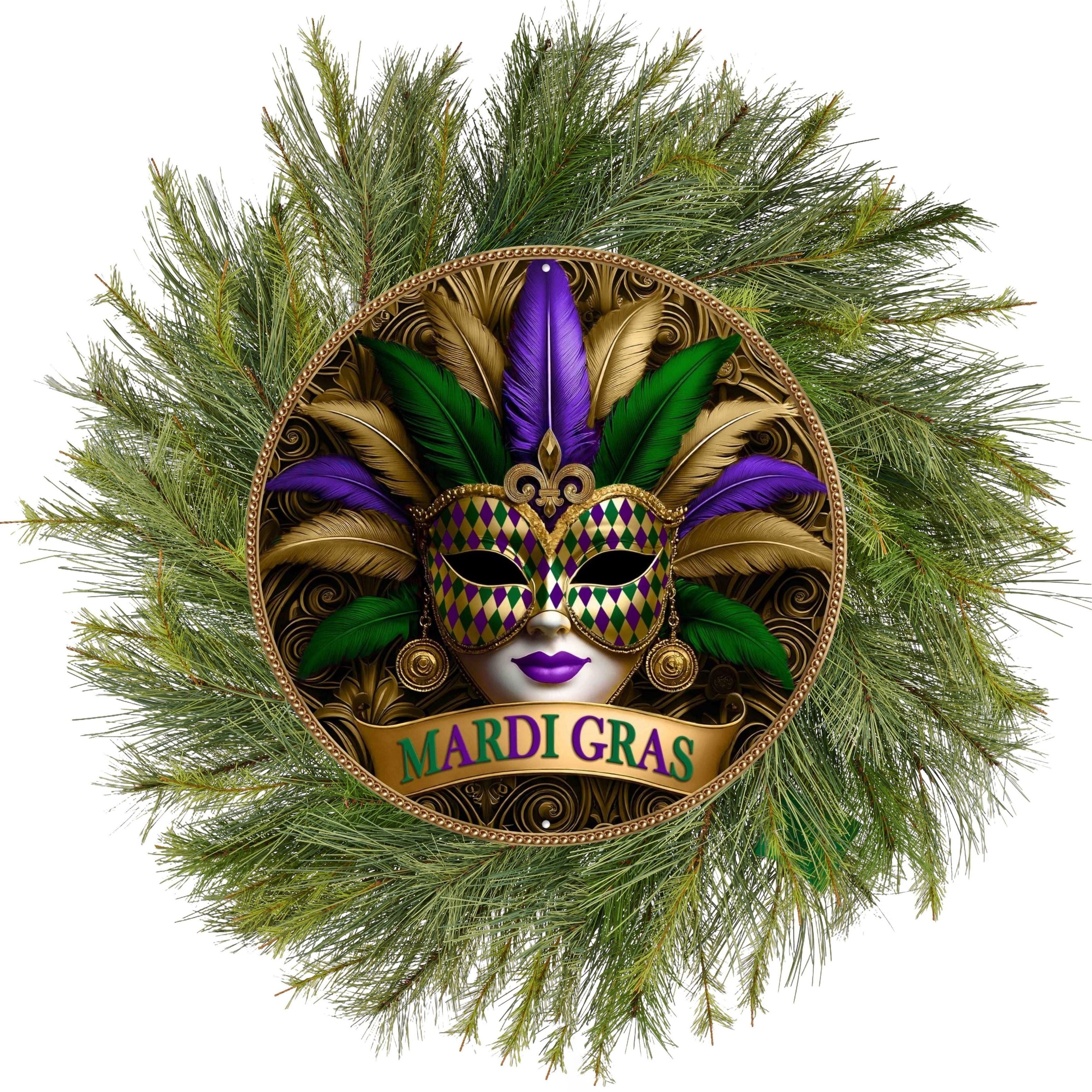 Bring the vibrant essence of Mardi Gras into your space with this striking 12-inch metal round sign showcasing an ornate gilded mask. The intricate design features a sophisticated metallic finish that captures the festive elegance of New Orleans tradition. Strategically placed mounting holes at the top and bottom allow for versatile wall or door installation, making it an effortless addition to any room seeking bold, celebratory character. MD176041