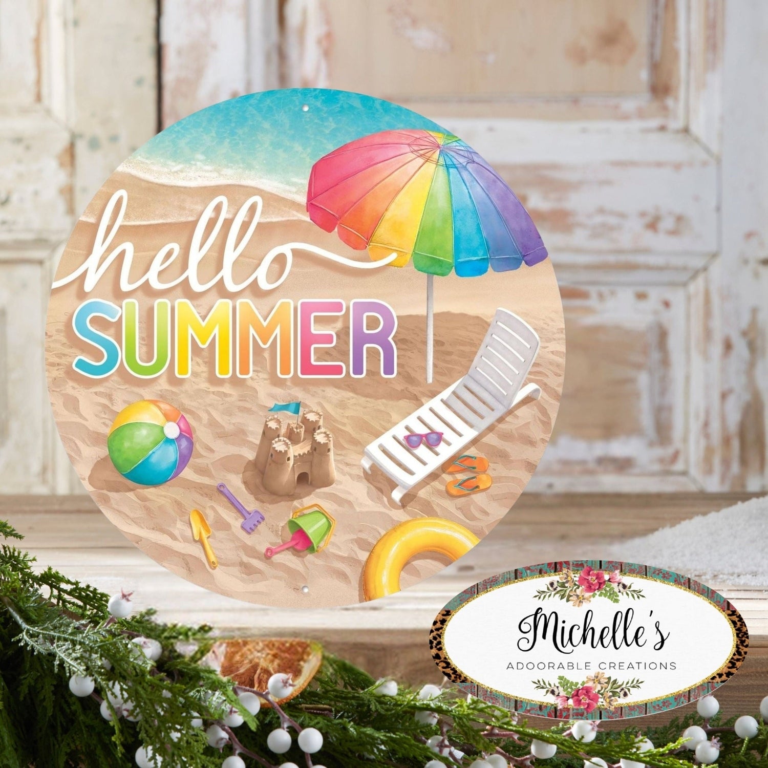 Bring seasonal warmth to your entryway with this 12" metal round sign celebrating summer's arrival. The beach-themed design combines durability with aesthetic appeal, making it a versatile décor choice for doors, walls, or wreath displays. Pre-drilled mounting holes at the top and bottom ensure straightforward installation, allowing you to showcase this charming accent piece wherever it's needed most. Dimension: 12"D and 3/16" thick. MD1738