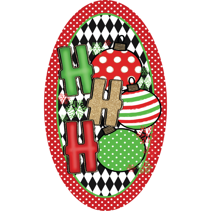 This Oval Ho Ho Ho Christmas Ornament Sign features a durable UV coating and warmly welcomes guests with the festive phrase "Ho Ho Ho" accompanied by colorful holiday ornament graphics. Encircled by a red and white polka dot border, its adaptable design makes it ideal as a wreath embellishment, door hanger, or wall accent, adding a sophisticated seasonal touch to any space.