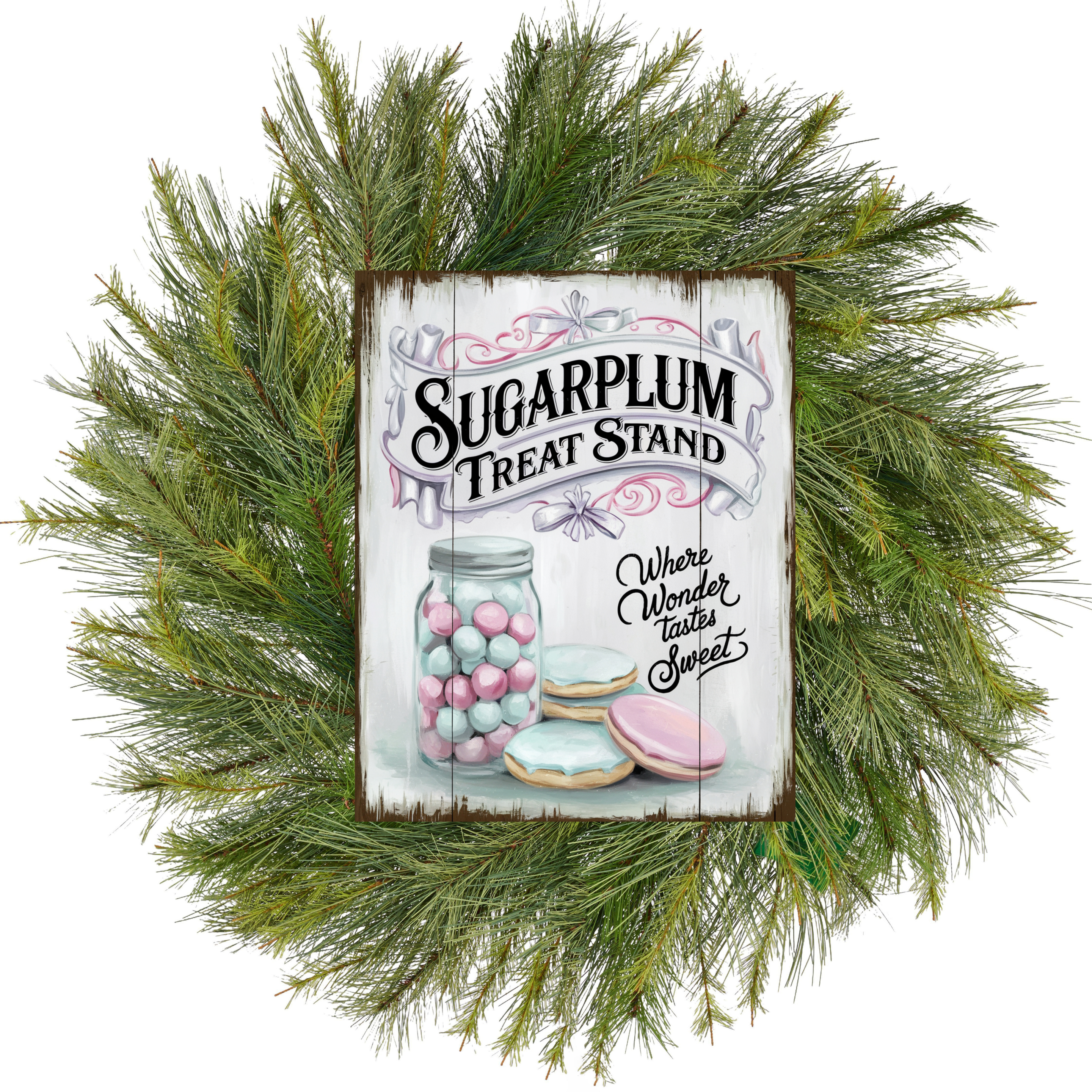 Transform your space with this charming vintage-style Sugarplum Treat Stand sign, where whimsy meets classic holiday appeal. The delightful design features a mason jar brimming with pastel candies alongside frosted cookies, all rendered in soft, nostalgic hues. The elegant script proclaims 'Where Wonder tastes Sweet,' creating an enchanting focal point for your seasonal decor. Crafted from durable UV-coated aluminum, this lightweight 8 x 10 inch sign maintains its beauty while being easy to handle and display. Versatile enough to serve as a wreath accent, door hanger, or wall decoration, it adds a touch of sweetness to any holiday setting. The distressed white background and delicate pink and gray accents create a timeless aesthetic that complements both traditional and modern Christmas decorations. Perfect for kitchens, dining rooms, or any space where you want to sprinkle a bit of holiday magic. Measures 8" x 10"