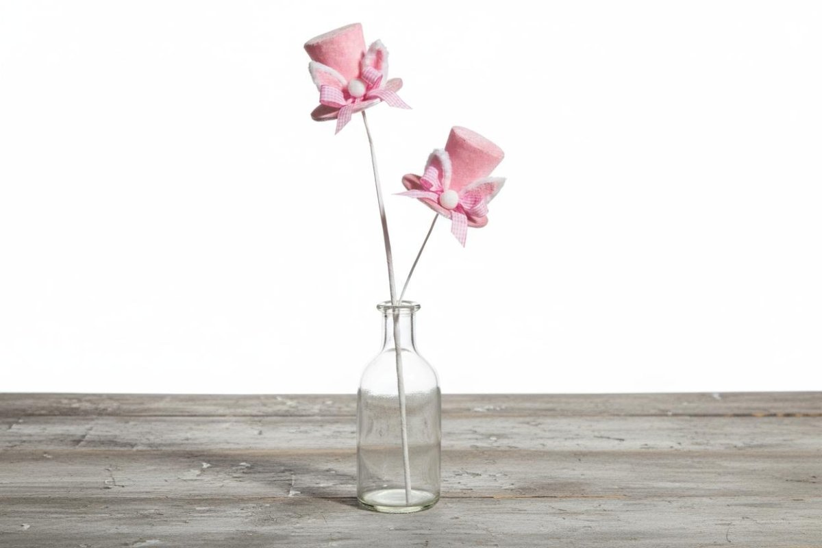 Bring springtime cheer to your seasonal displays with this delightful 24" bunny hat pick. Crafted with soft pink top hats adorned with fuzzy bunny ears and gingham bow accents, it delivers instant Easter appeal to any arrangement. The elongated stem slides effortlessly into floral designs, wreaths, baskets, and tabletop décor, making it a versatile addition to your spring styling toolkit. Whether you're refreshing a mantel, enhancing a centerpiece, or layering into a mixed arrangement, this charming accent piece brings playful personality and festive warmth to your holiday decorating.