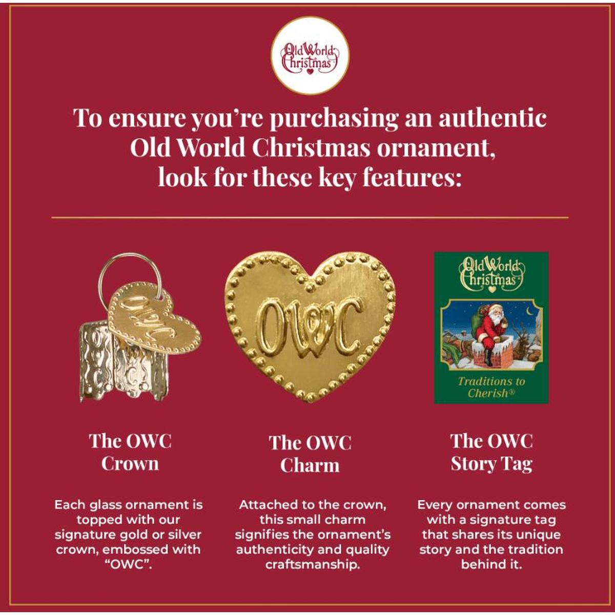 - Heart-shaped bauble depicts OWC Trademark Logo certifying that this is an Old World original