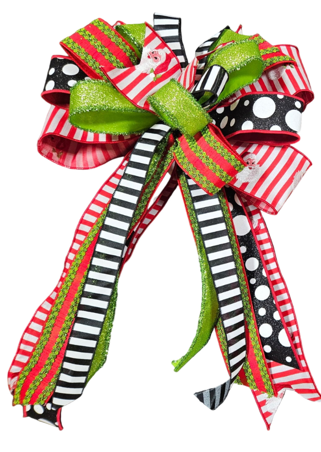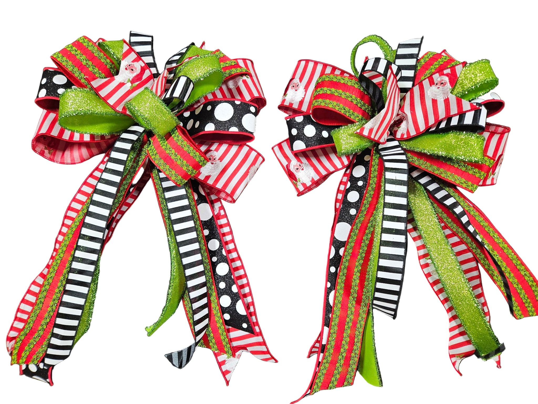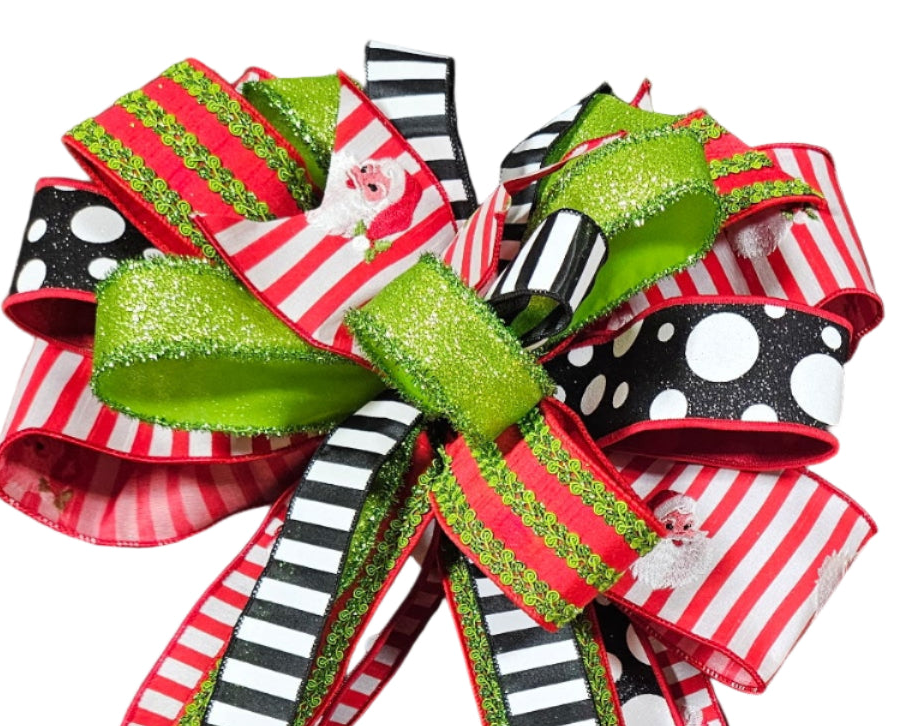 Bring enchanting holiday spirit to your home with this charming Santa-inspired bow, featuring a carefully curated palette of red, white, black, and green accents. The playful Santa face design adds personality and warmth to any seasonal setting, whether displayed on entryways, woven through garlands, or positioned atop your tree. This versatile accent piece harmonizes effortlessly with both classic and contemporary holiday aesthetics, making it a sophisticated choice for any décor approach. Perfect for creating that magical, joyful atmosphere throughout your space, this bow serves as a memorable focal point that captures the true essence of the season. (Sold Individually)