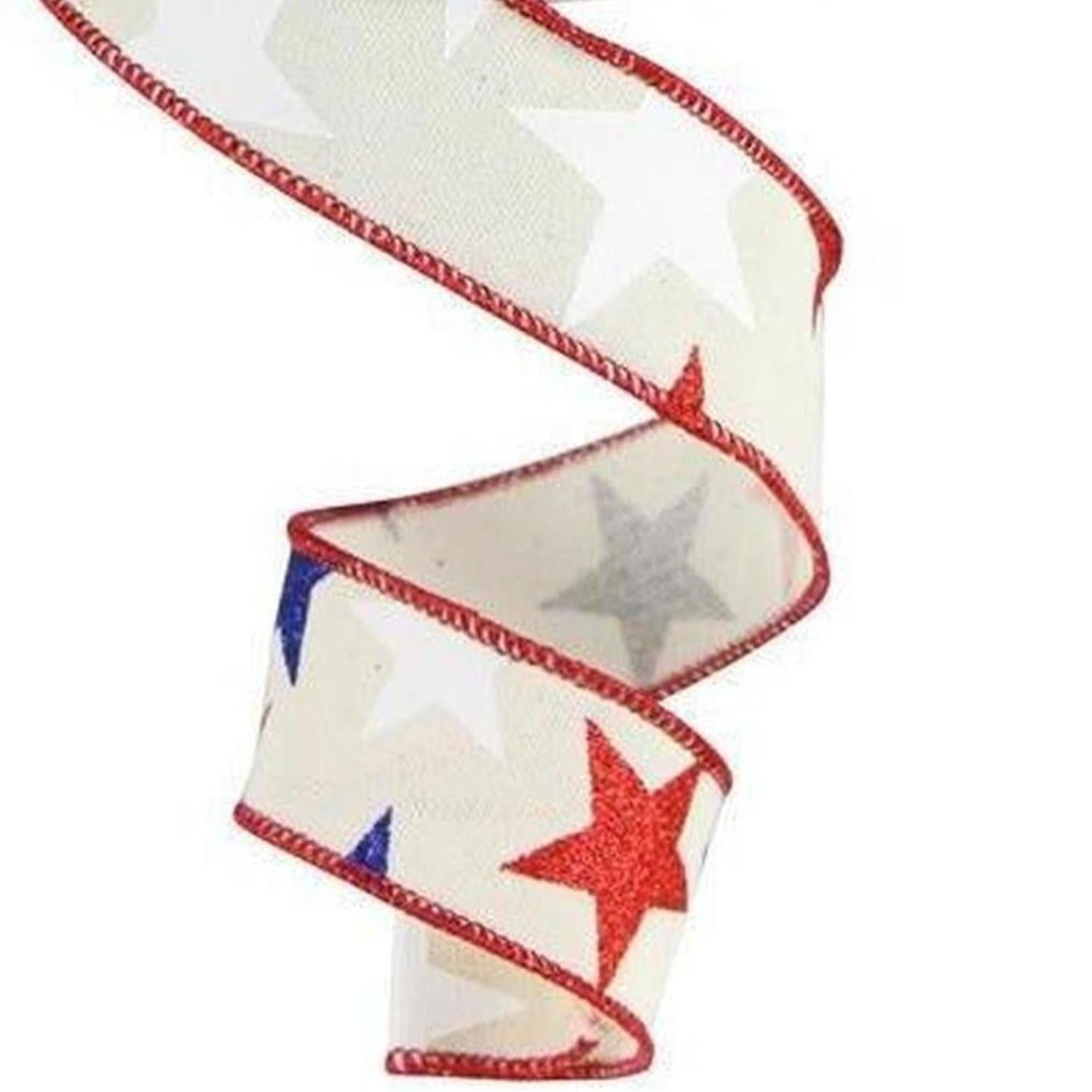 Shoot for the stars with your next display with this marvelous 1.5" Ivory Cotton Ribbon: Patriotic Stars (10 Yards)! This ribbon features a wired edge, with a patriotic star pattern set against an ivory background, making it a versatile addition to any display you see fit! Pair it with some holiday-themed sprays, or a decorative sign to set it over the top! Perfect for creating a unique and whimsical Patriotic or Sports display. RG0193133