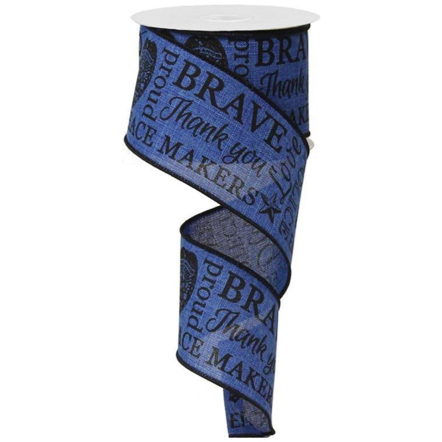 2.5" wide royal burlap ribbon featuring a woven royal blue background with matte black print. Sayings like, "Protect & Serve," "Thank You," and "Peace Makers" are included with badge images. The roll of ribbon is 10 yards long, and the wired edge is attached using a framing matte black stitching. Great for indoor and outdoor projects. Specialty ribbon; Use for any creative or decorative venture you can think of; High quality design; Multi-functional & multi-useful. RG0159225
