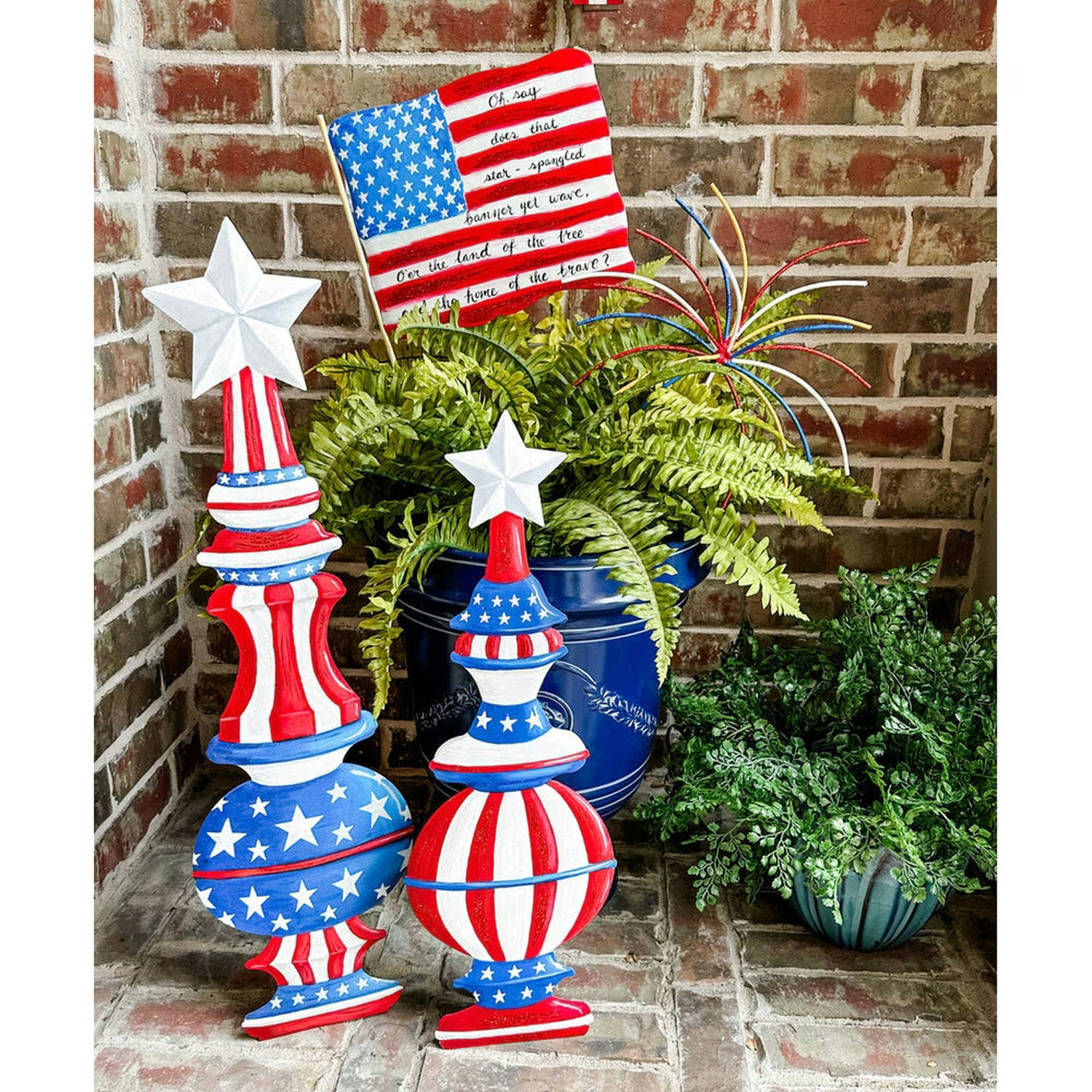 Celebrate American pride with these versatile patriotic topiaries. Designed for multiple display methods—stake them into planters and garden beds, hang them as wall accents, or position them on an easel for tabletop showcasing—these pieces adapt seamlessly to any décor scheme. Ideal for Fourth of July celebrations, memorial observances, or year-round patriotic styling, they bring sophisticated seasonal flair to indoor and outdoor spaces. A professional choice for crafters and decorators seeking quality pieces with enduring appeal.