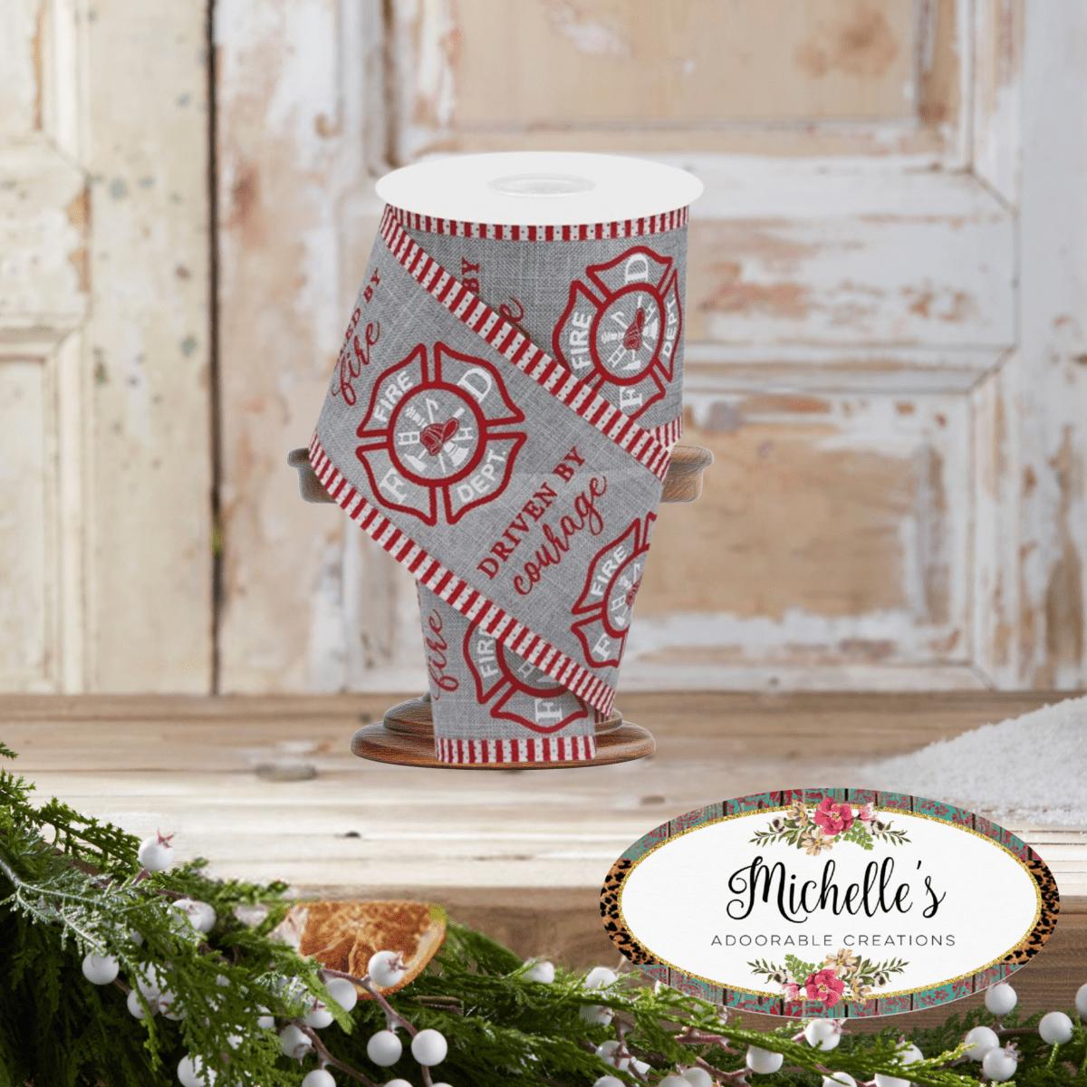 A ten yard roll of 2.75" of light grey ribbon printed firemen badges and tools between the words. Thin horizontal red lines run along the edges of this wired ribbon. Ideal for crafting, bows, and décor, this ribbon is as durable as it is stylish. Its firefighting motif adds a special touch to any project. RGA808110