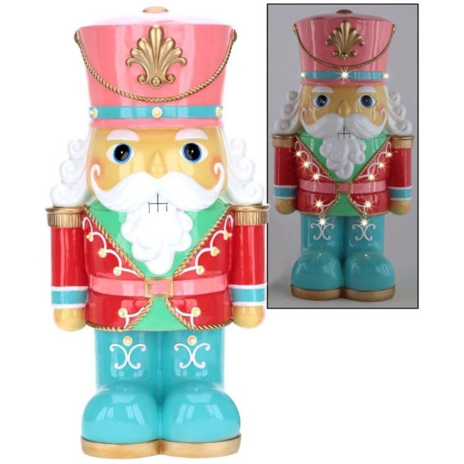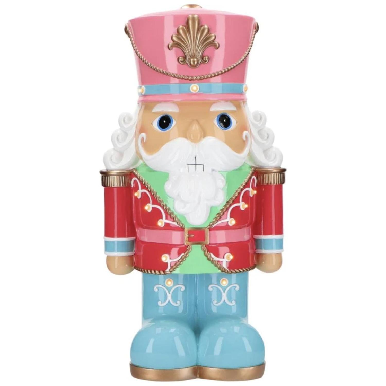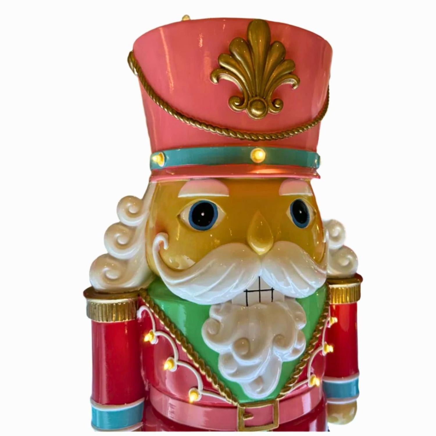 Stand guard in style with this vibrant holiday figure dressed in a playful palette of peppermint pastels. With a glossy pink hat, baby blue boots, and a candy-apple red coat trimmed in gold, this merry character brings a modern twist to a timeless tradition. Finished with curly white hair, a bold mustache, and charming hand-painted details, it's a sweet statement piece perfect for any festive setting. 72-56704