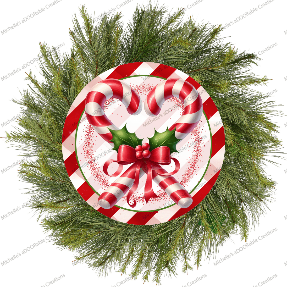 This Candy Cane Heart Round Sign showcases two candy canes joined to create a heart, accented by a red holly bow. Its red and white striped border and background highlight the festive peppermint design. Made from .025 gauge aluminum with a UV coating, it offers durability and versatility, perfect for wreaths, door hangers, wall decorations, tree ornaments, tier trays, and more. Available in 8", 10", and 12" sizes to fit a variety of display options.