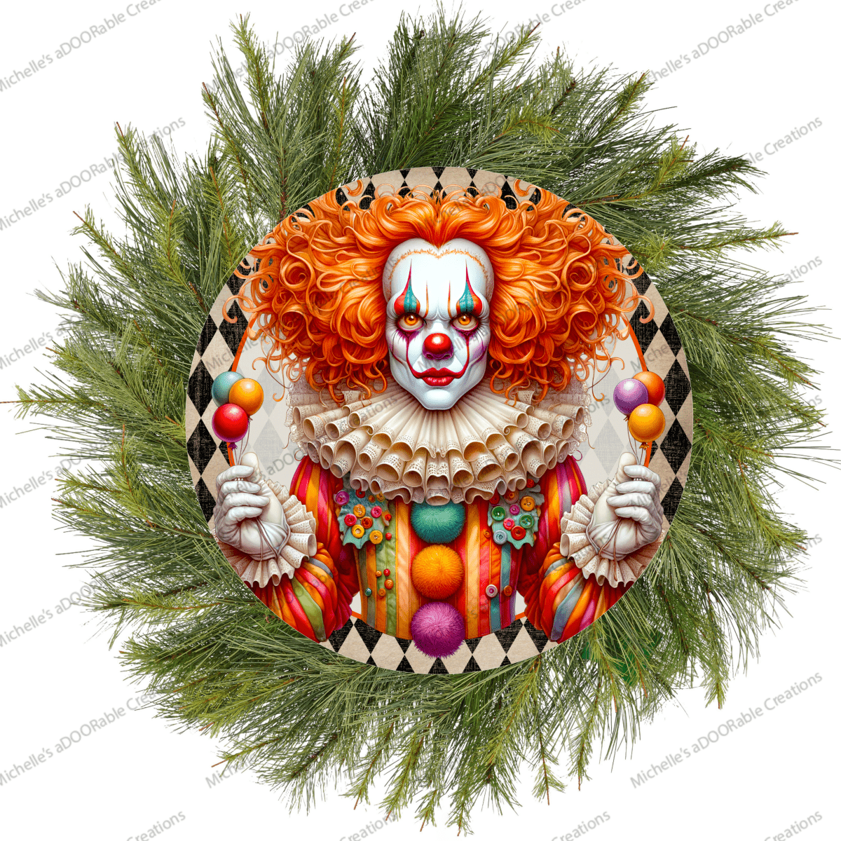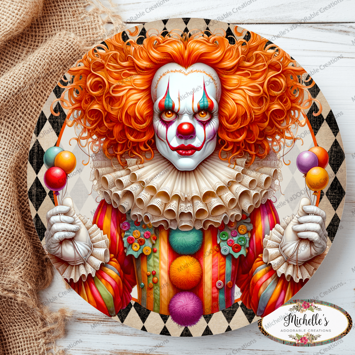 Enhance your Halloween decor with this vivid Colorful Halloween Clown Round Sign. Made from sturdy aluminum, it features a bold circus clown with bright orange hair set against a vintage black harlequin background, creating a striking and eerie effect. Perfect for wreath embellishments, door hangers, wall mounts, or as a focal point, this versatile sign adds festive charm to any setting. Offered in 8", 10", and 12" sizes, it provides flexible options to suit your seasonal decorating needs.