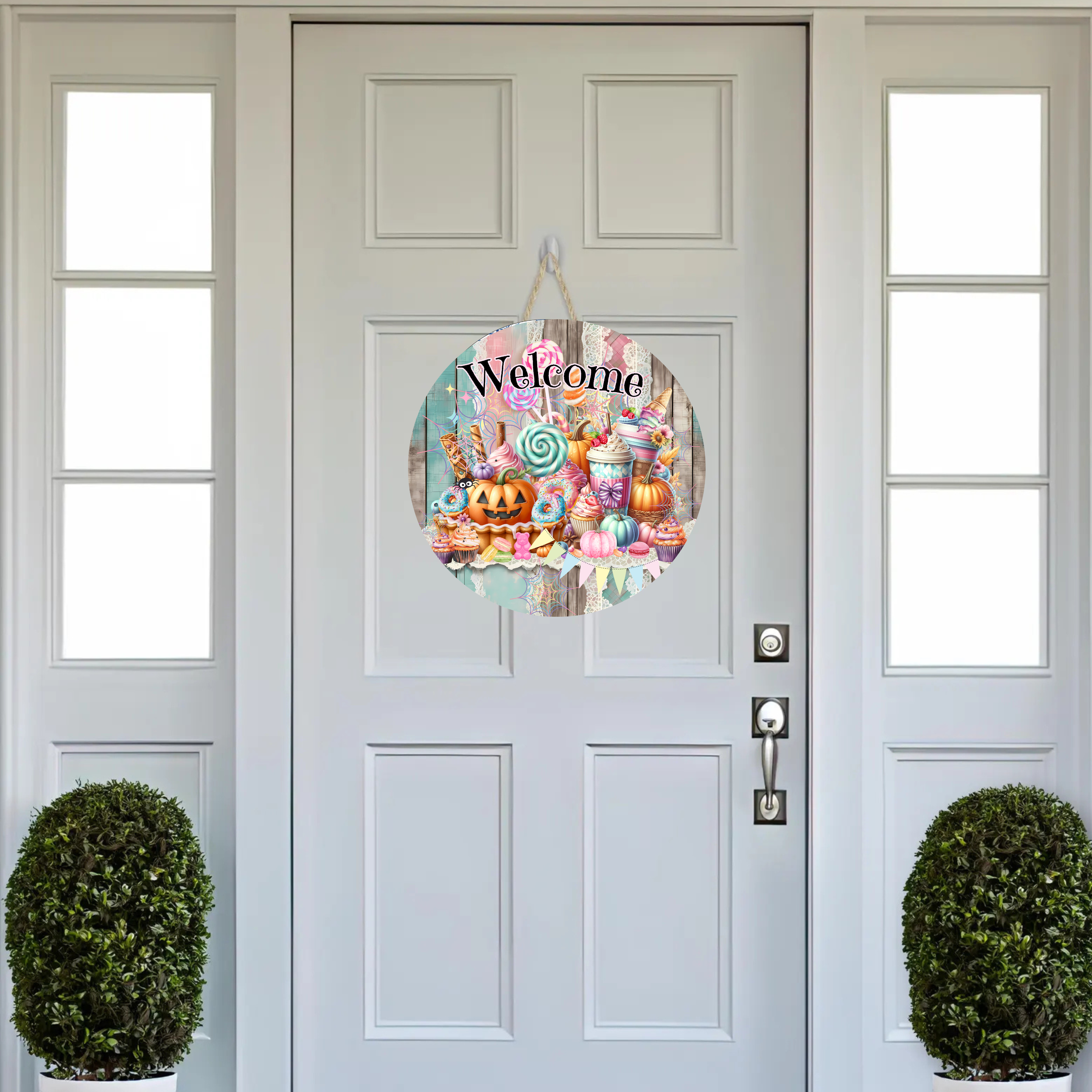 This versatile and durable aluminum sign features a festive "Welcome" message adorned with pastel Halloween candy. Its design allows for multiple uses, such as a wreath accent, door hanger, or wall art. Choose from 8", 10", or 12" sizes to perfectly fit your space.