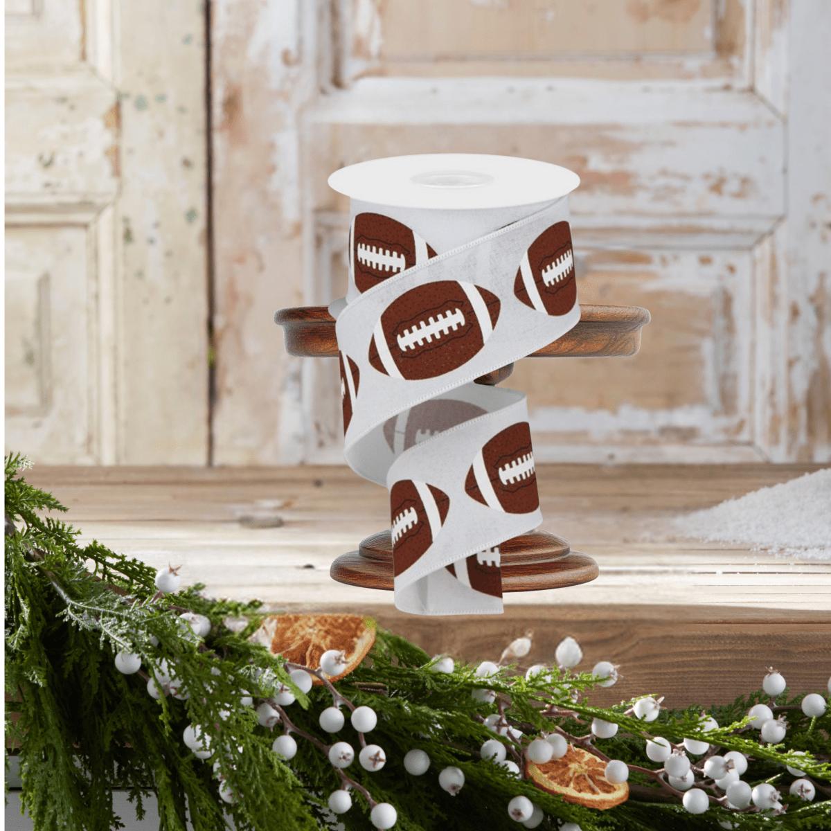 Build the ultimate sports display with this 2.5" Football Royal Ribbon: White (10 Yards)! This ribbon features a wired edge, along with a collection of footballs against a solid white base! This ribbon will be ideal for a wreath display, complete with sprays and picks, ornaments, or even a themed sign! RGA136927