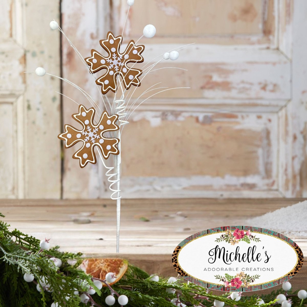 Take part in the holiday spirit with this 27" Gingerbread Cookie Spray! Featuring two gingerbread-shaped snowflakes made from brown felt, adorned with delicate white icing and sprinkled with clear glitter for a sweet touch. Along with white glitter grass, white glitter balls add a touch of playfulness and happiness to your holiday décor. 86449BN