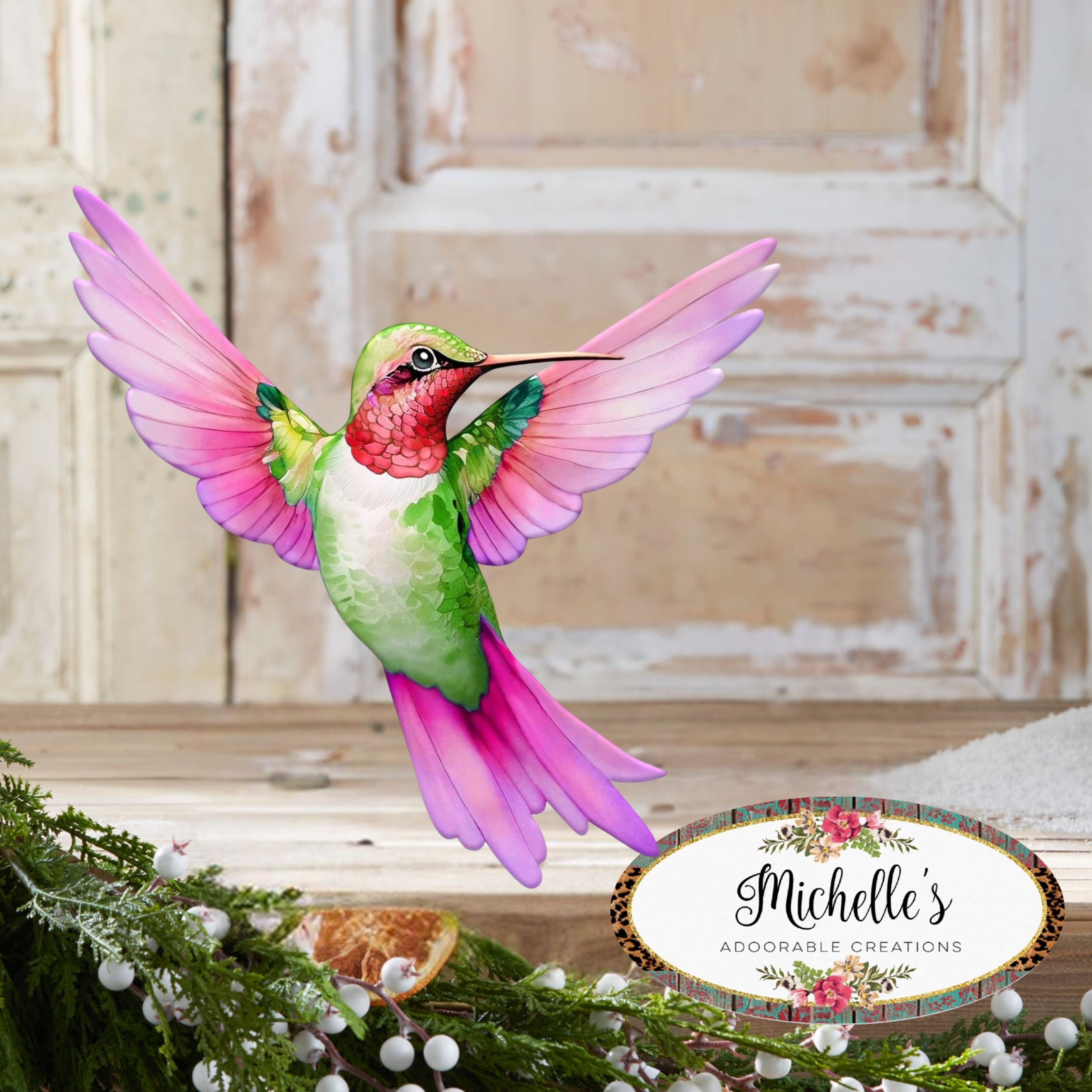 12" Metal Embossed Hummingbird Sign: Pink/Green