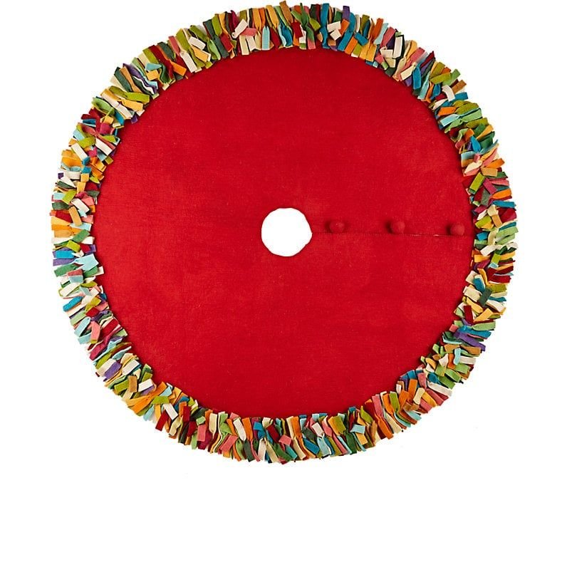Classic red tree skirt is updated with a bright multicolored fringe border. Snazzy and stylish, this tree skirt will bring together all your holiday decor.