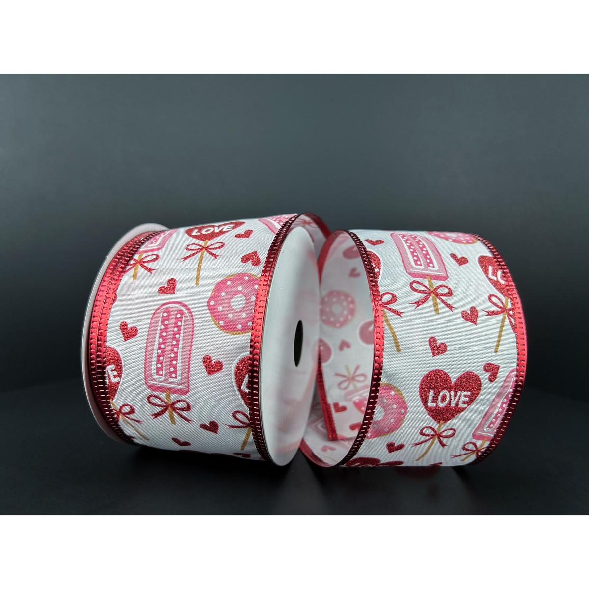 This ten yard roll of 2.5" wide white satin ribbon features valentine themed donuts, popsicles and candy with wired edges. Perfect for crafting a special finishing touch for Valentine's Day, it offers an elegant appearance and a sparkle that will add character to any wreath, gift or DIY project. 15401-40-01