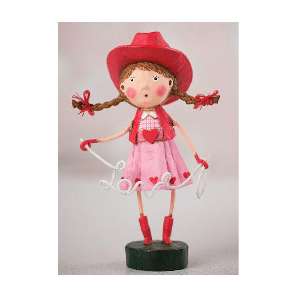 Bring Western charm and Valentine's spirit to your home with this delightful cowgirl figurine by Lori Mitchell. Dressed in a vibrant red and pink outfit with charming braided pigtails, she confidently wields her lasso shaped into the word LOVE. Her playful stance and spirited expression capture the essence of a modern-day Cupid with a cowpoke twist. Perfect for those who appreciate whimsical décor with personality, Lassoed By Love adds warmth and character to mantels, shelves, and Valentine's displays. An ideal gift for Western enthusiasts and romantics alike, this figurine celebrates love with bold, creative flair that's impossible to ignore.