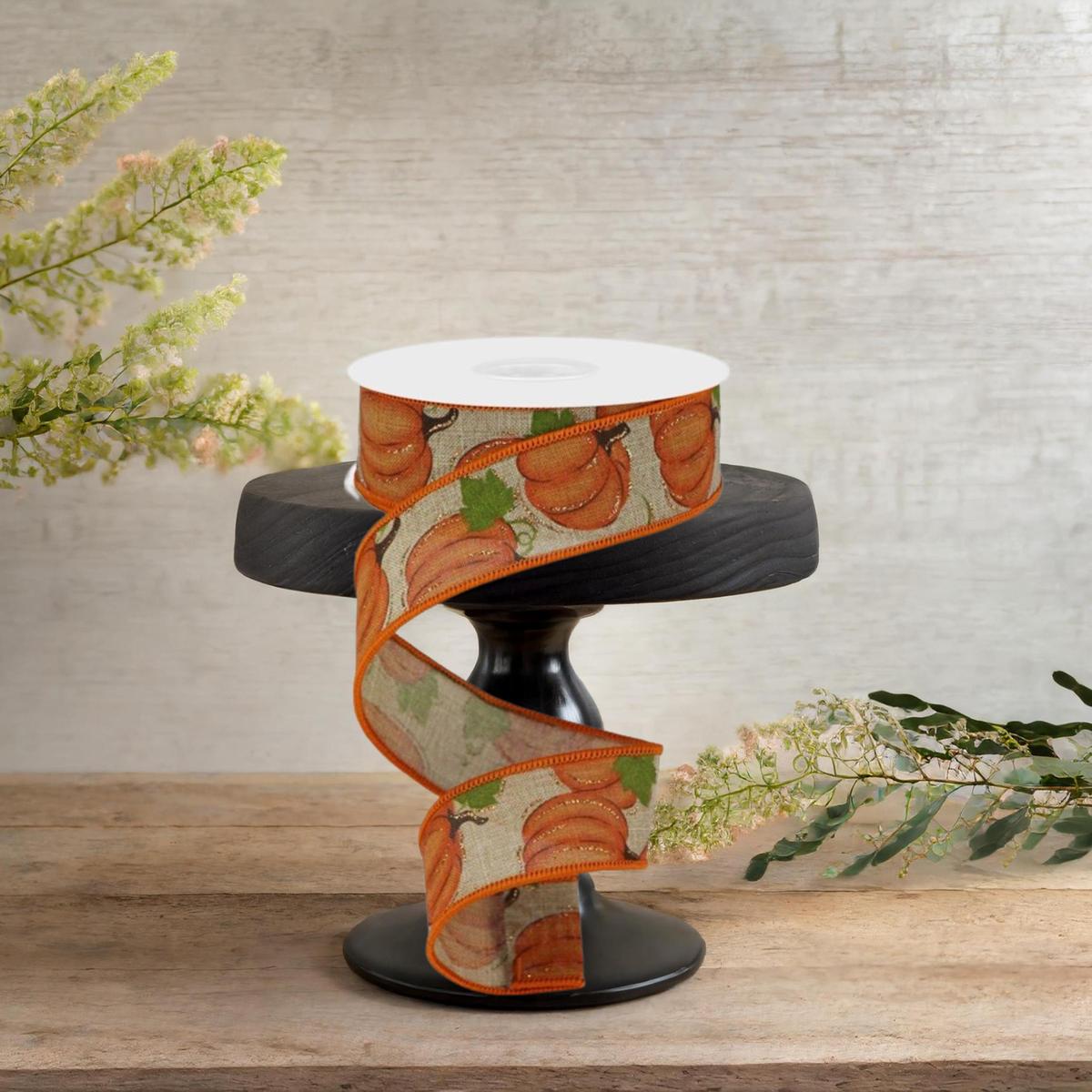 Bring the warmth of fall into your home with this charming 1.5 inch wide pumpkin patch print on a light beige wired edge ribbon. The 10 yard roll offers plenty of material for gift wrapping, Fall and Autumn decorating, wreath making, and DIY crafts. The wired edge allows for easy shaping and manipulation, making it perfect for creating beautiful bows, garlands, and embellishments. Celebrate the cozy and festive season with this versatile ribbon that adds a touch of harvest charm to any project. Measuring approximately 1.5 inches wide, this ribbon is perfect for adding a pop of color and texture to your seasonal decor. RGA147301