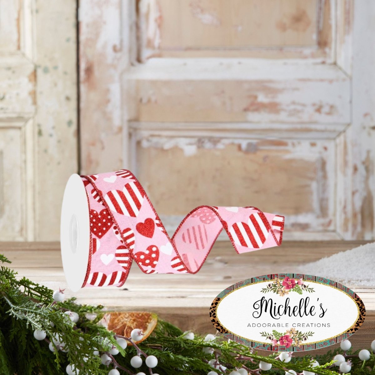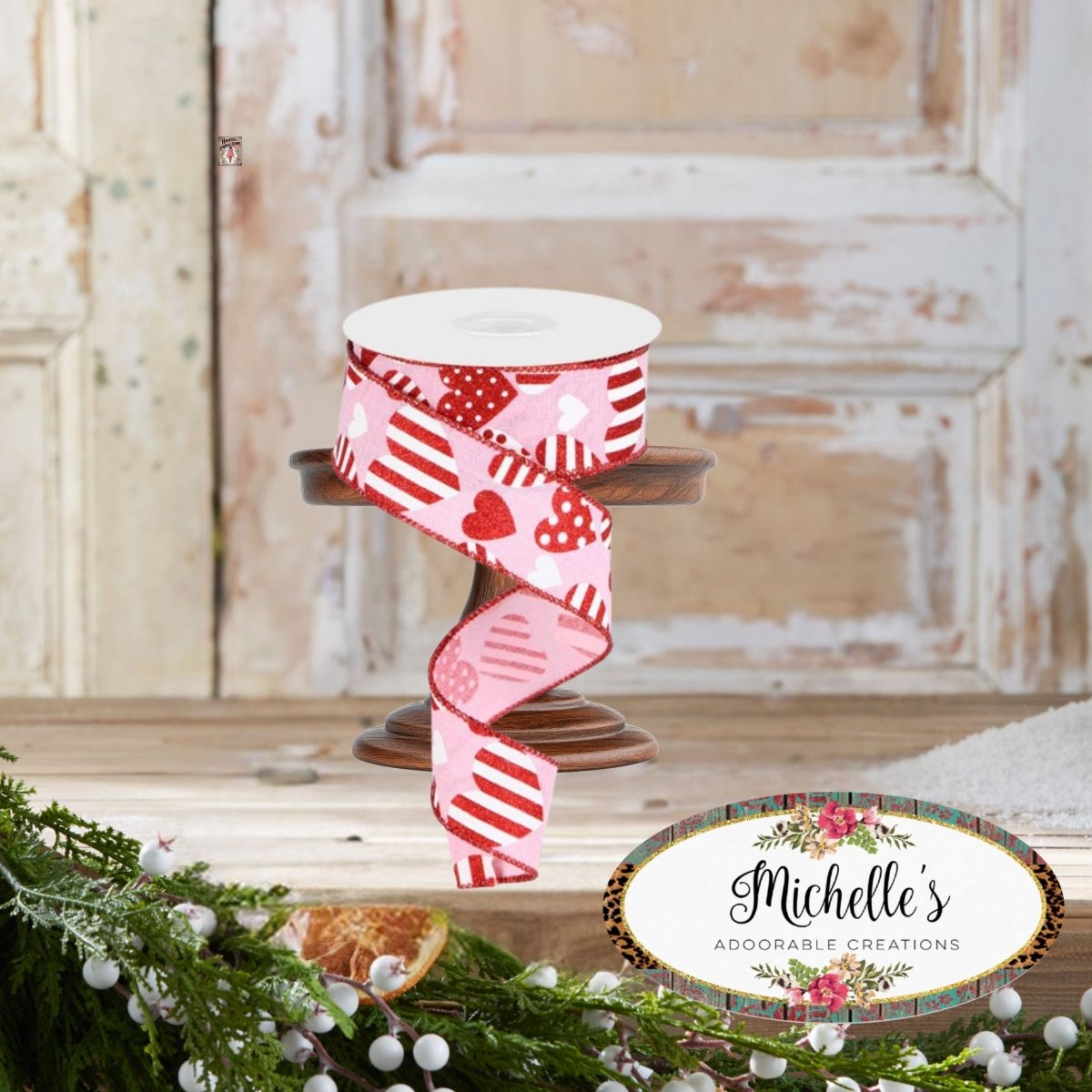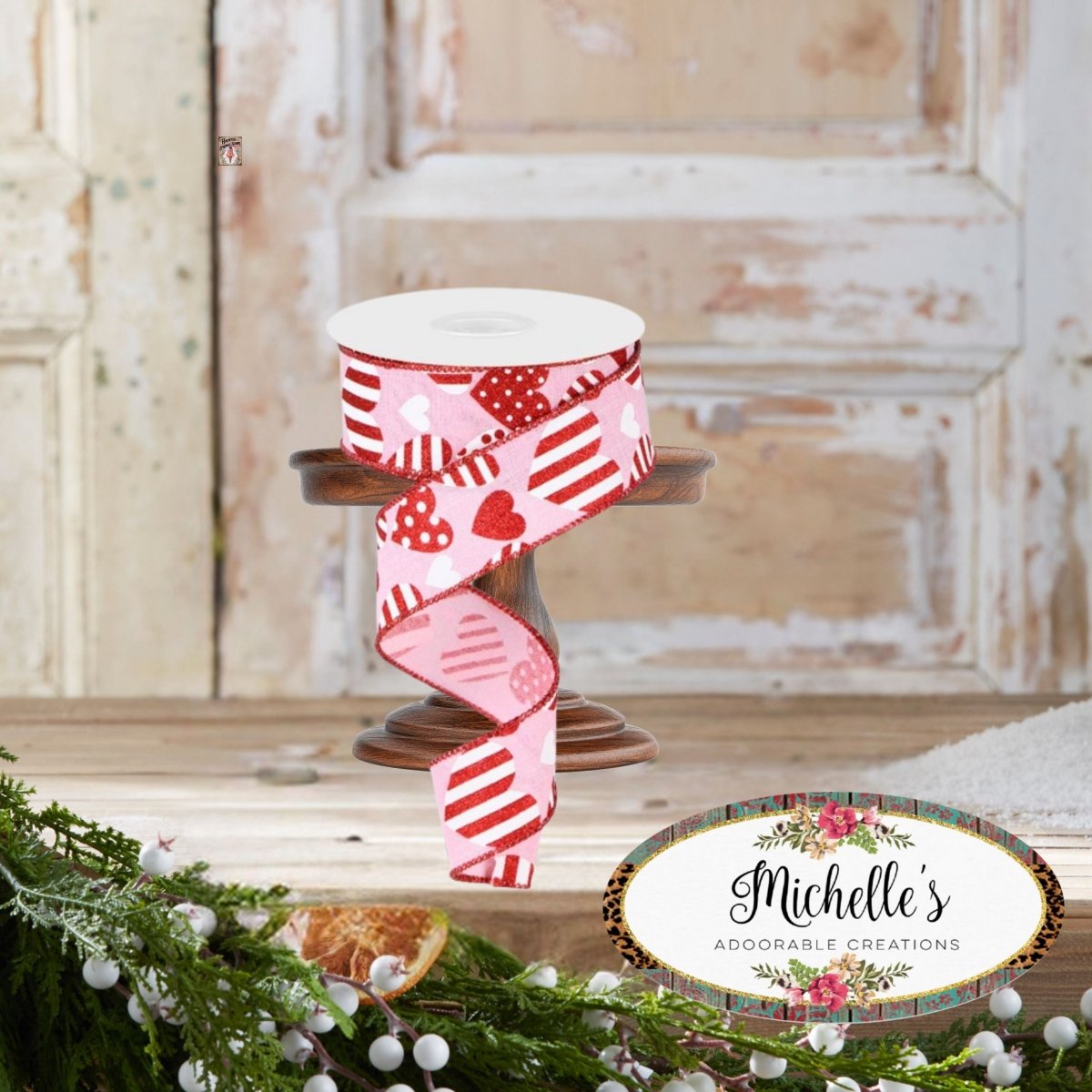 Fall in love with this marvelous valentine hearts on royal burlap ribbon! This ribbon features a sewn wired edge, plus a variety of patterned hearts against a light pink base to create an eye-catching piece. Use this ribbon in designing your own custom wreath, and let it take on a lovely theme! RGC183815