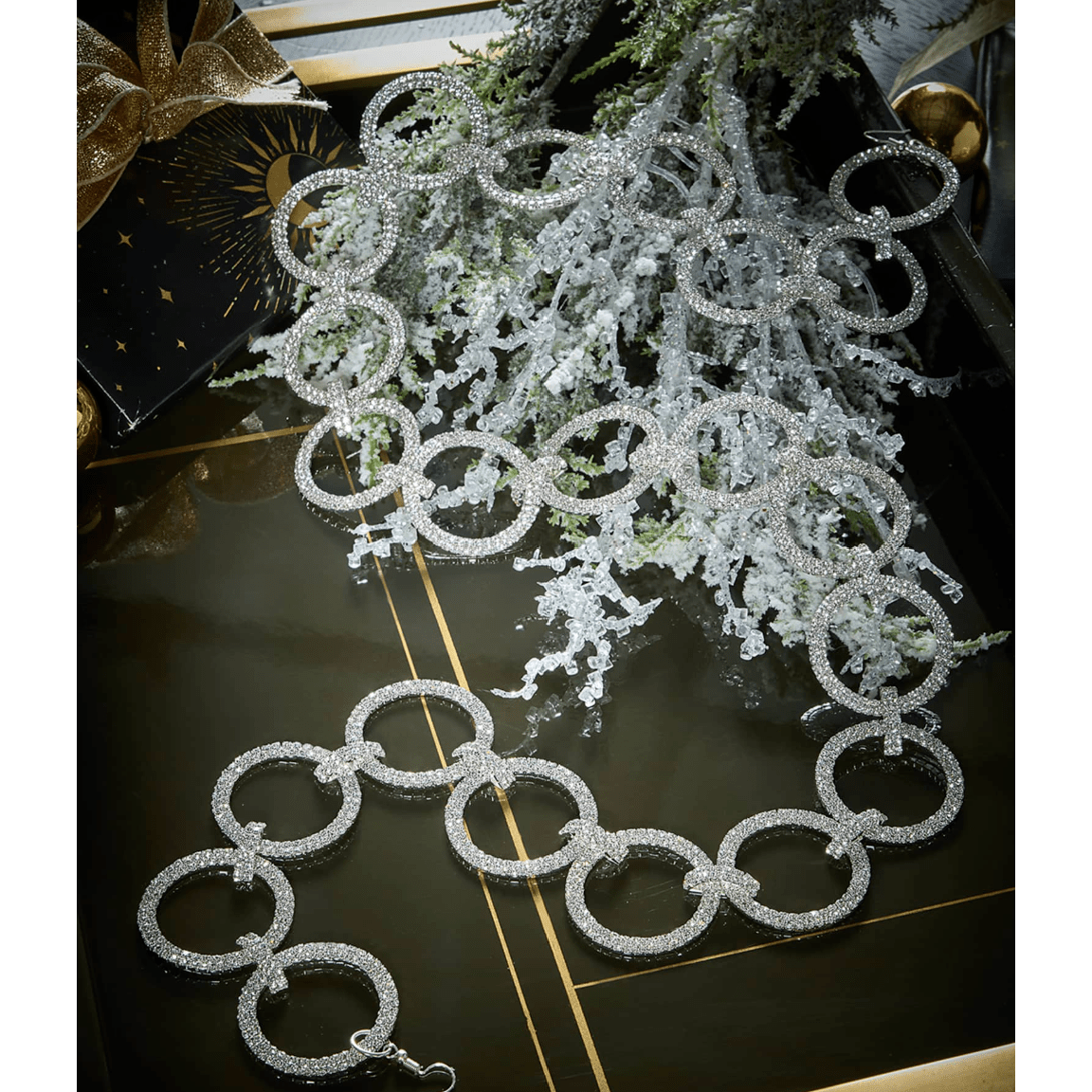 Featuring stunning silver embellishments, this 1.5" x 36" crystal garland with hooks adds a touch of elegance to any room. Perfect for adding a touch of luxury to your holiday decor, this garland is sure to impress with its intricate design and high-quality materials. Don't settle for ordinary decorations, elevate your space with this exquisite garland. Elevate your designs with our high-quality D. Stevens Fine Ribbon today. 12-1231