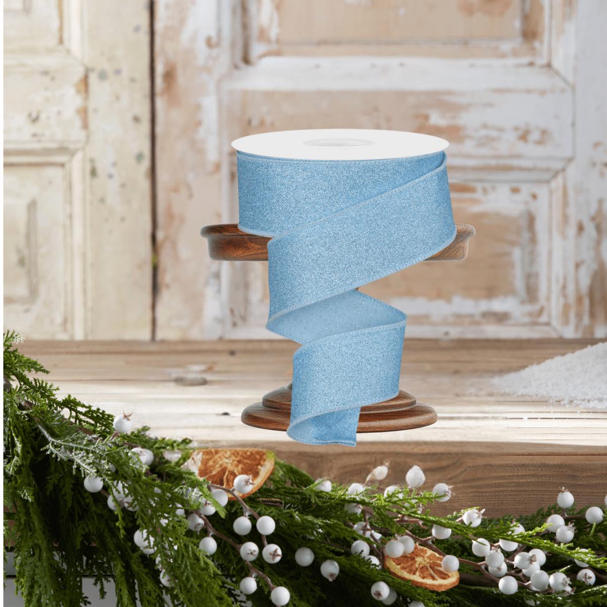 Add this versatile 1.5" Fine Glitter On Royal Ribbon: Pale Blue (10 Yards) to any display you see fit! It's wired edge and pale blue base, with matching fine glitter throughout makes it an adaptable addition to any decorative piece of your choosing. Add additional ribbon, sprays or signs to create the perfect display. RGE1380H1
