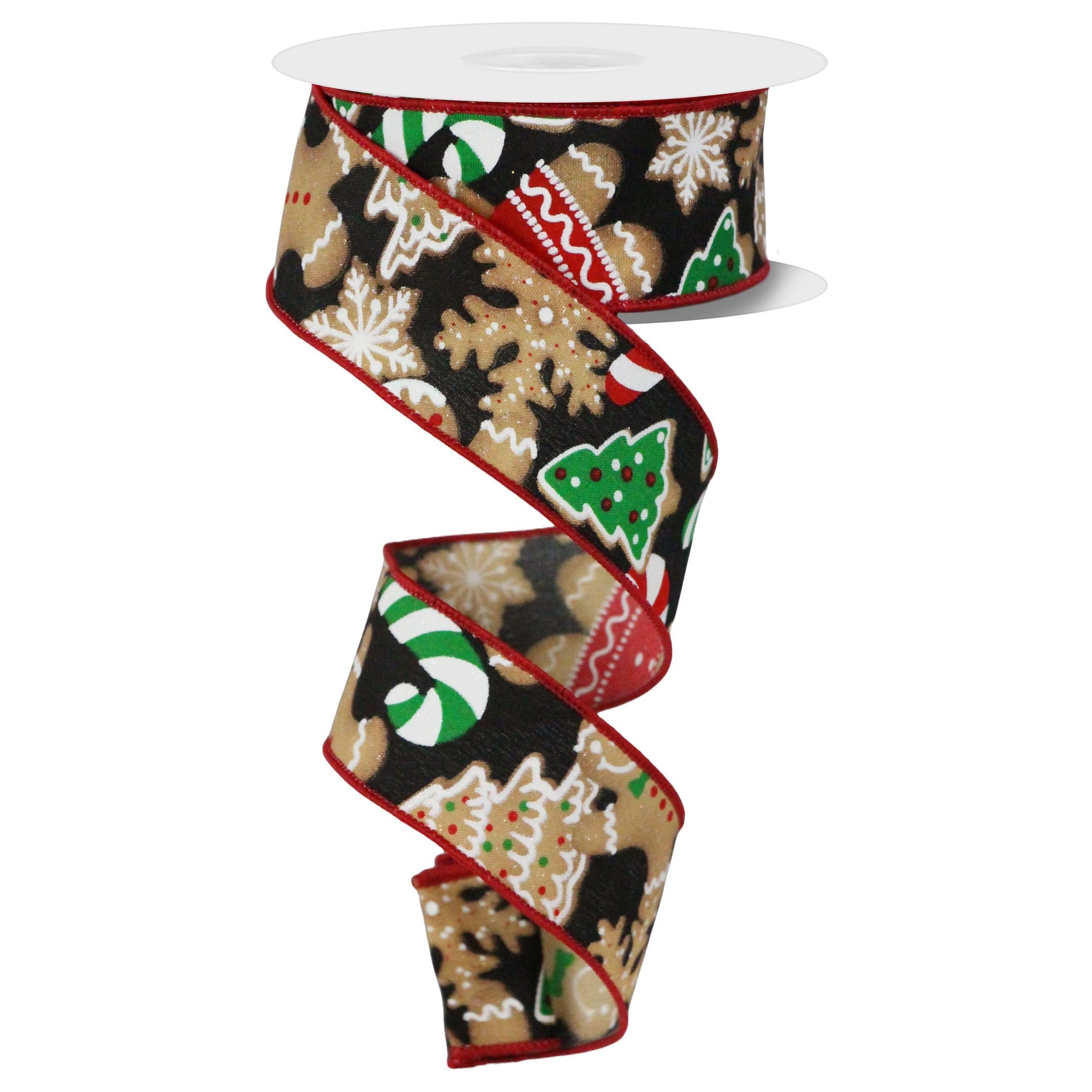 Wrap this delightful gingerbread cookie on black backing ribbon to celebrate the tastiest Christmas cookie around! This wired edge ribbon includes a multitude of gingerbread figures and trees, along with sweet candies throughout, making this ribbon compatible with many holiday themes! Add additional ribbon, sprays or signs to create the perfect display. Part of our Gingerbread Lane Collection. RGE188402