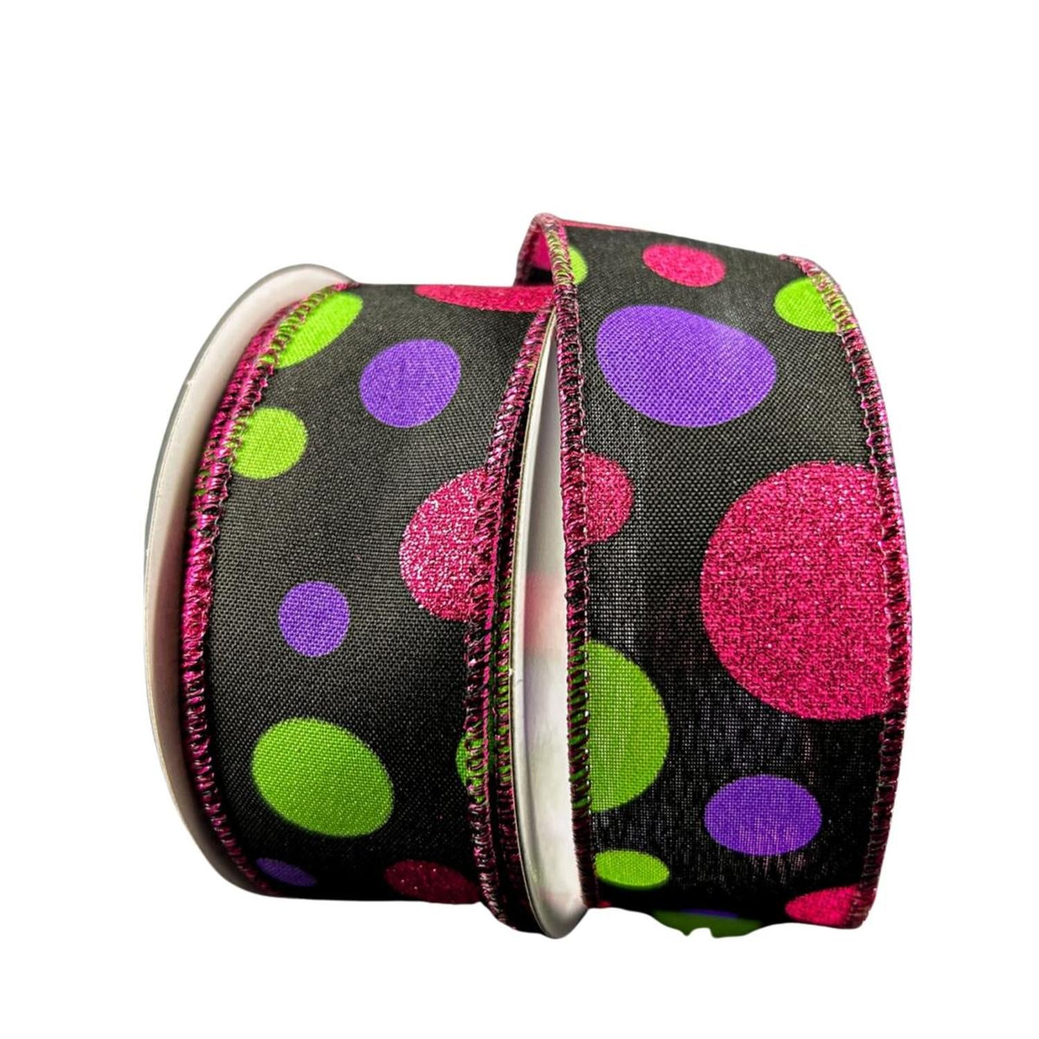 1.5" Glitter Dots Black Ribbon: Fuchsia, Lime Green Purple (10 Yards)