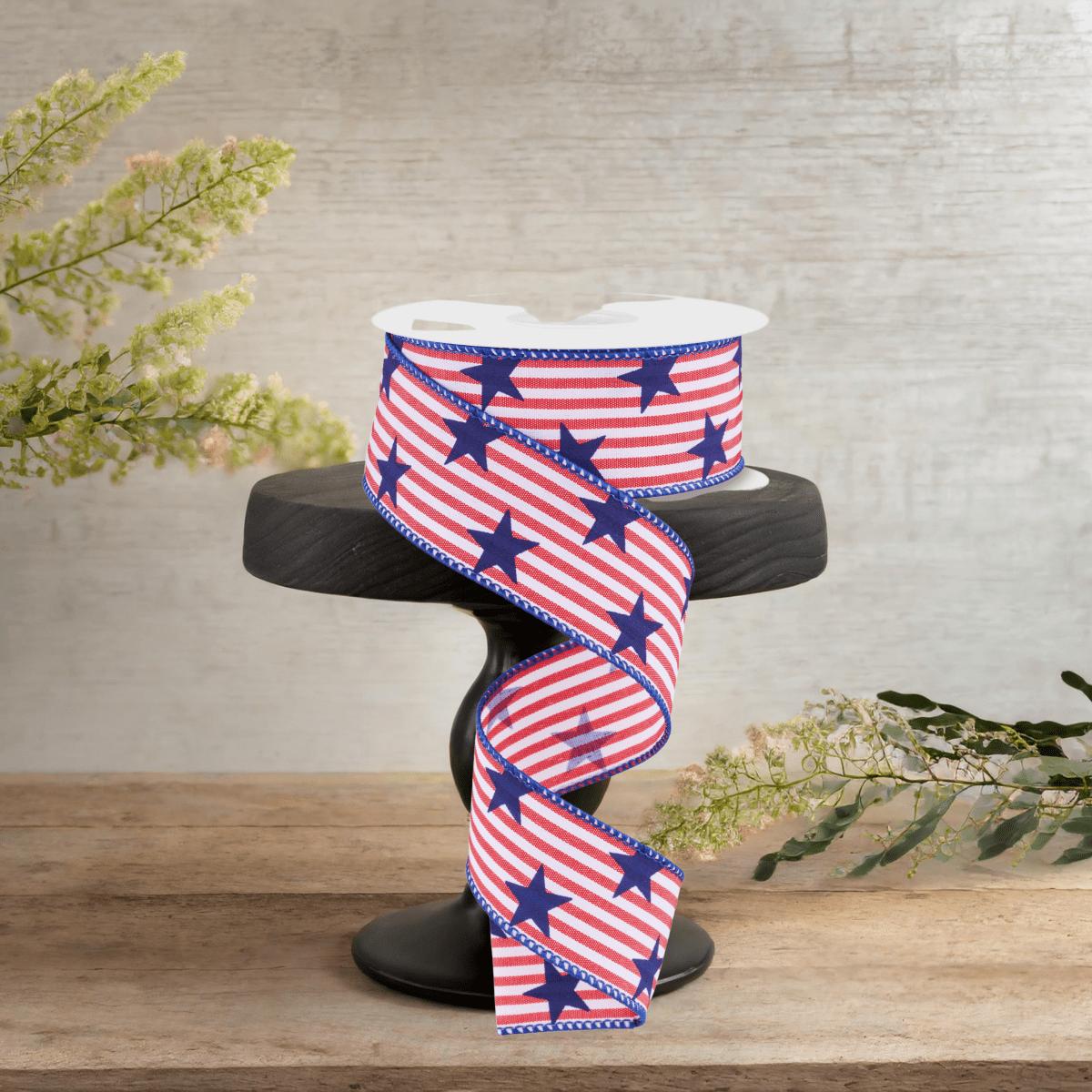 Shoot for the stars with your next display with this marvelous 1.5" Stars On Woven Stripe: Navy Blue (10 Yards)! This ribbon features a wired edge, with a patriotic star pattern set against a red and white striped background, making it a versatile addition to any display you see fit! Pair it with some holiday-themed sprays, or a decorative sign to set it over the top! Perfect for creating a unique and whimsical Patriotic or Sports display. RGF1034W7
