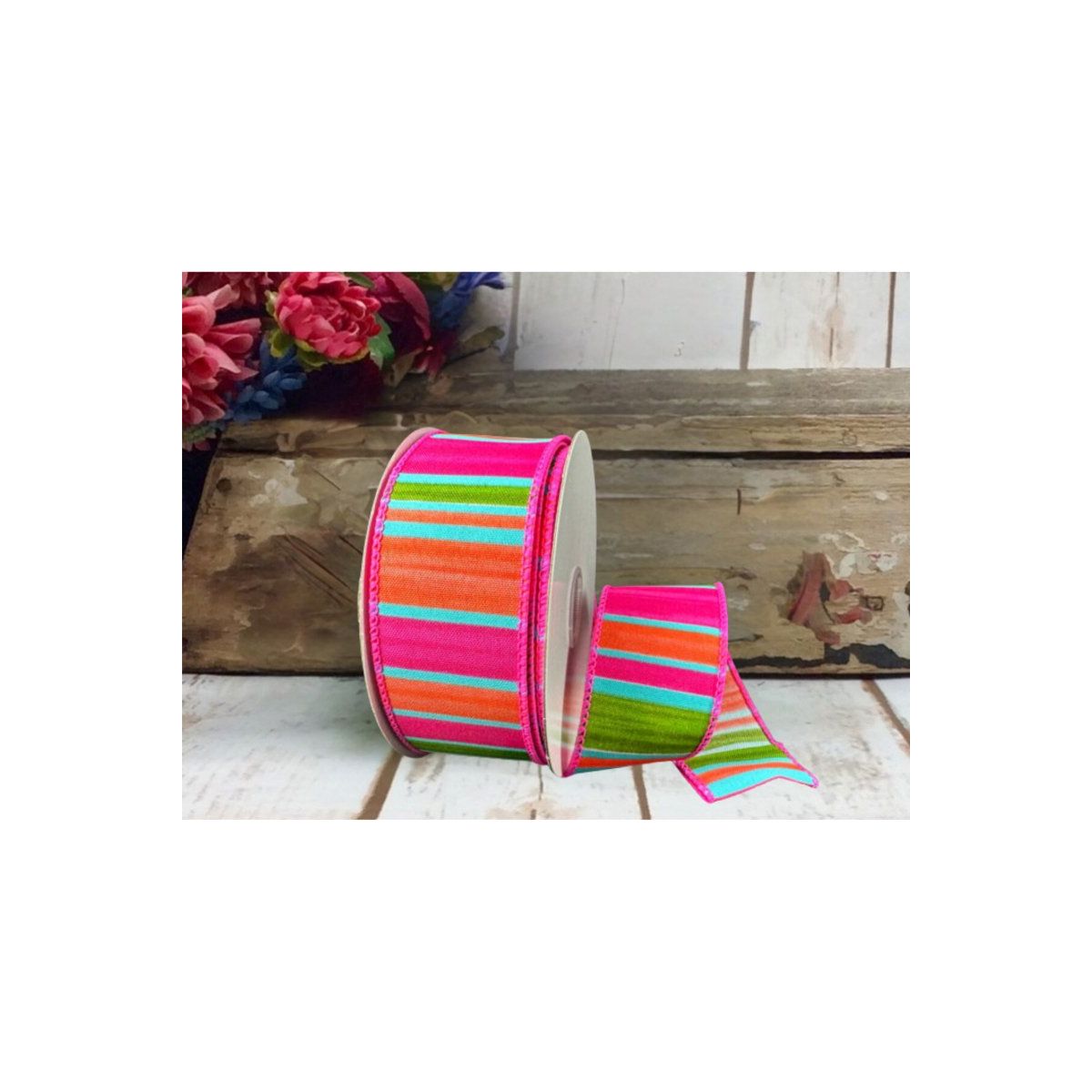 Add a vibrant pop of color to your crafting projects with this stunning wired edge ribbon featuring a cheerful horizontal stripe pattern. The 1 1/2-inch wide ribbon comes in a generous 10-yard roll, perfect for multiple projects. Set against a bright fuchsia base, the ribbon showcases a delightful mix of turquoise, orange, and lime green stripes that create a fresh, modern look. The wired edges make it easy to shape, bend, and manipulate the ribbon into beautiful bows, loops, and decorative elements. Ideal for floral arrangements, wreath making, gift wrapping, and various DIY crafting projects. The durable construction ensures the ribbon holds its shape while remaining flexible enough to work with. Whether you're creating seasonal decorations, enhancing gift presentations, or adding finishing touches to craft projects, this versatile ribbon brings a splash of contemporary style to any creation. 41509-09-46