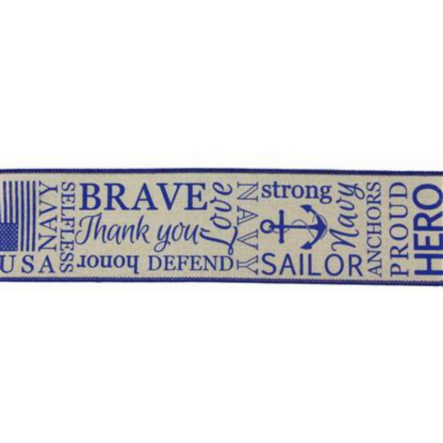 Support our heroes with this 2.5" United States Navy Ribbon: Natural & Blue  (10 Yards)! This wired edge ribbon features a collection of phrases and words, plus American flags and anchors throughout to earnestly represent it's subject matter. Use this ribbon in a patriotic display, with some complementary signs, sprays or picks! RG01824NF